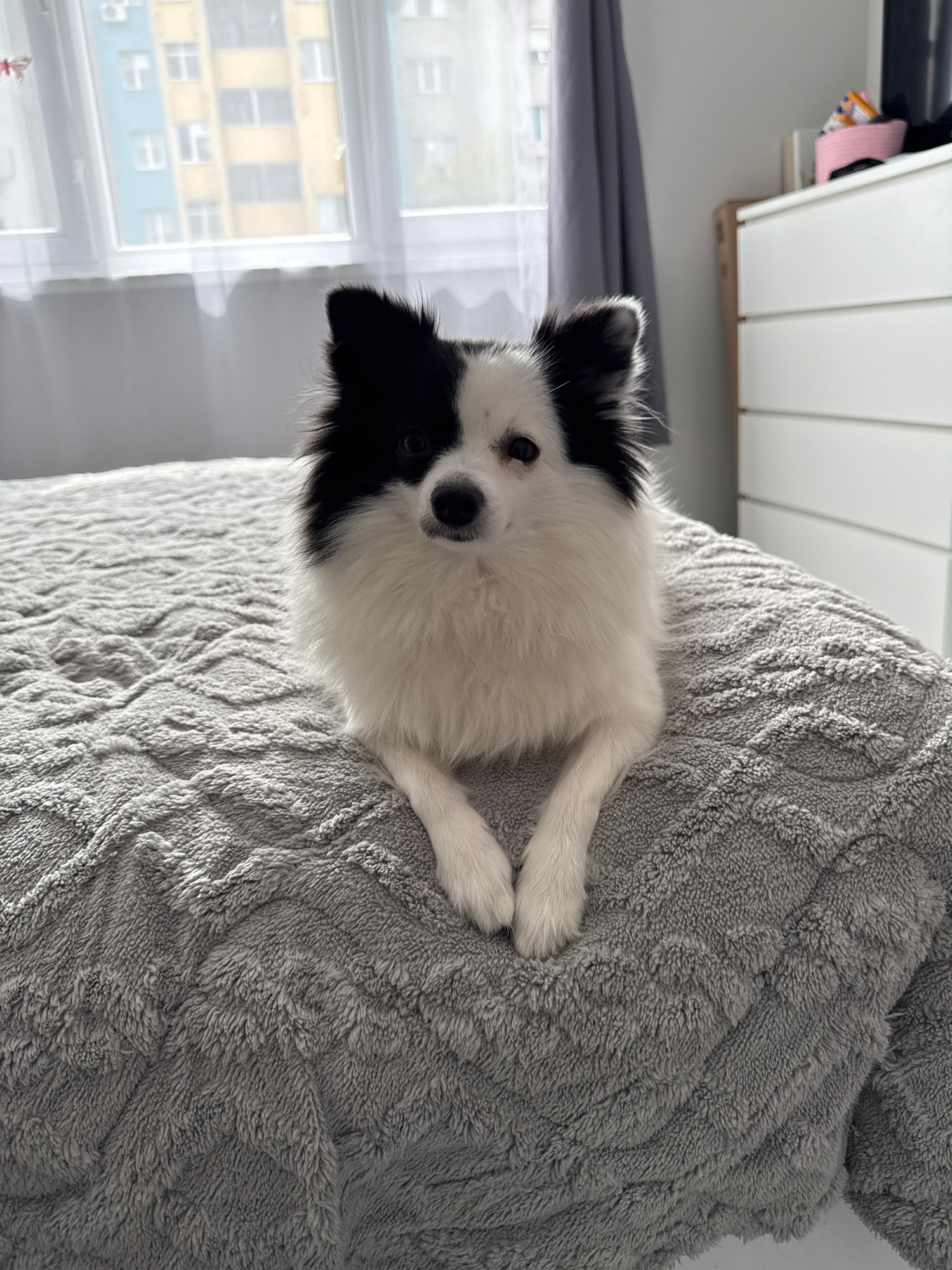 A black and white dog is lying on a gray textured blanket. The scene appears to be indoors, near a window where buildings are visible. The location might be Stara Zagora, Bulgaria, based on the buildi…read more