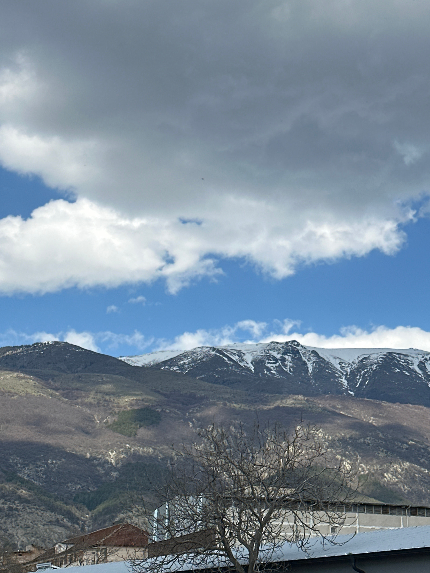The image shows a mountain range with snow-capped peaks and a partially cloudy sky. A bare tree stands in the foreground, partially obscuring a building. The location may be in or near Karlovo, Bulgarβ¦read more