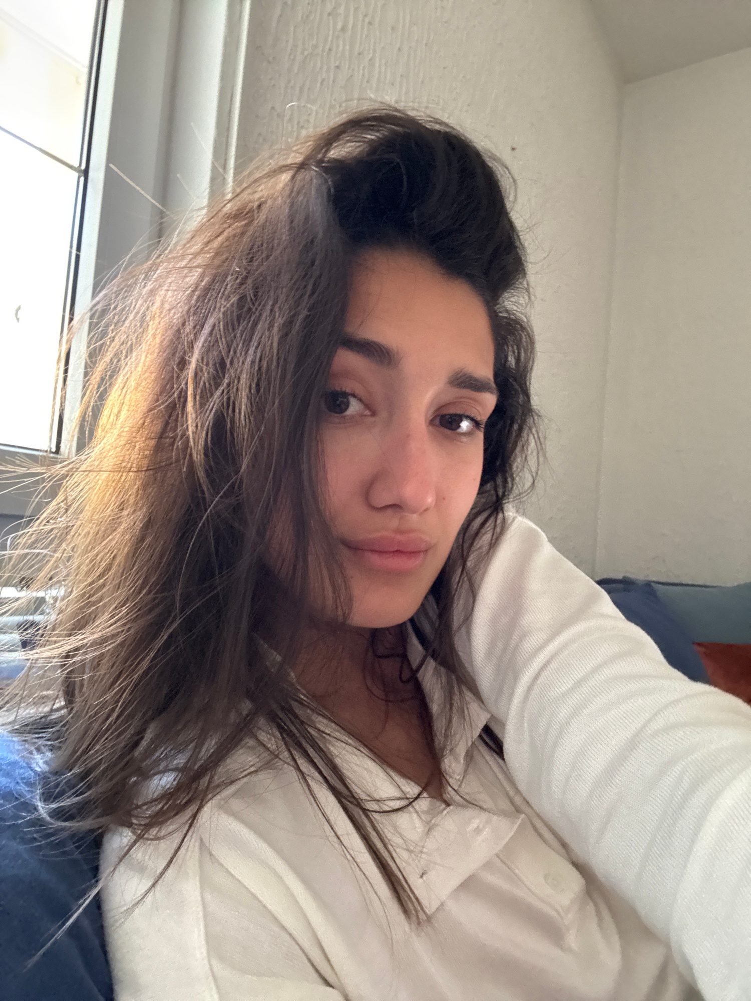 A woman with brown hair is pictured indoors. She is wearing a white shirt or blouse. She is lying down, angled towards the camera. Behind her, there is a blue and possibly orange object, likely a piec…read more