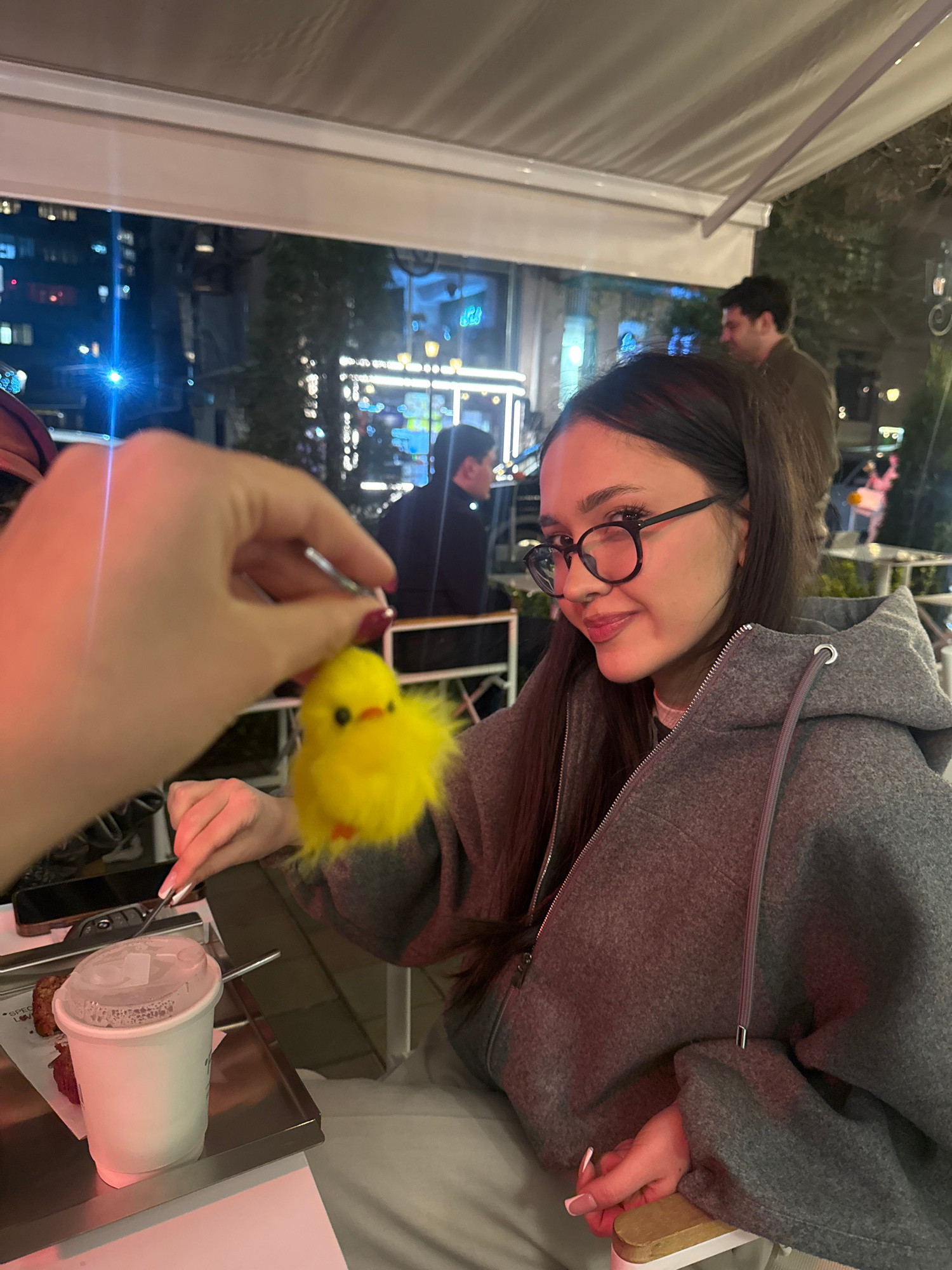 The image shows a woman wearing a gray hoodie and glasses, seated at an outdoor table. Another person is holding a small, yellow, fuzzy chick toy on a stick. The woman is smiling and looking at the to…read more