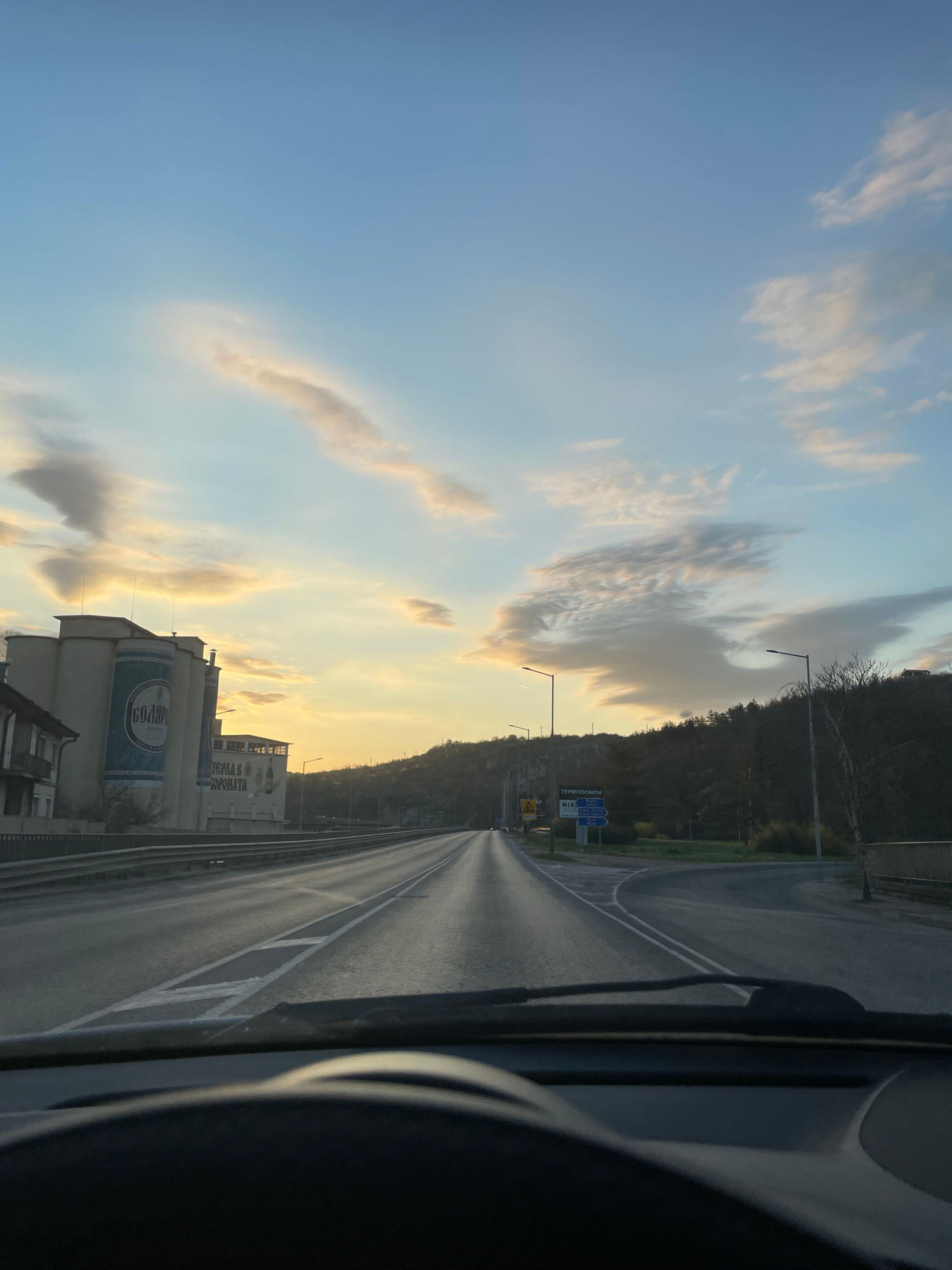 The image shows a view from inside a vehicle, looking out onto a road in Veliko Tarnovo, Bulgaria. The road stretches into the distance, flanked on one side by a forested hill and on the other by indu…read more