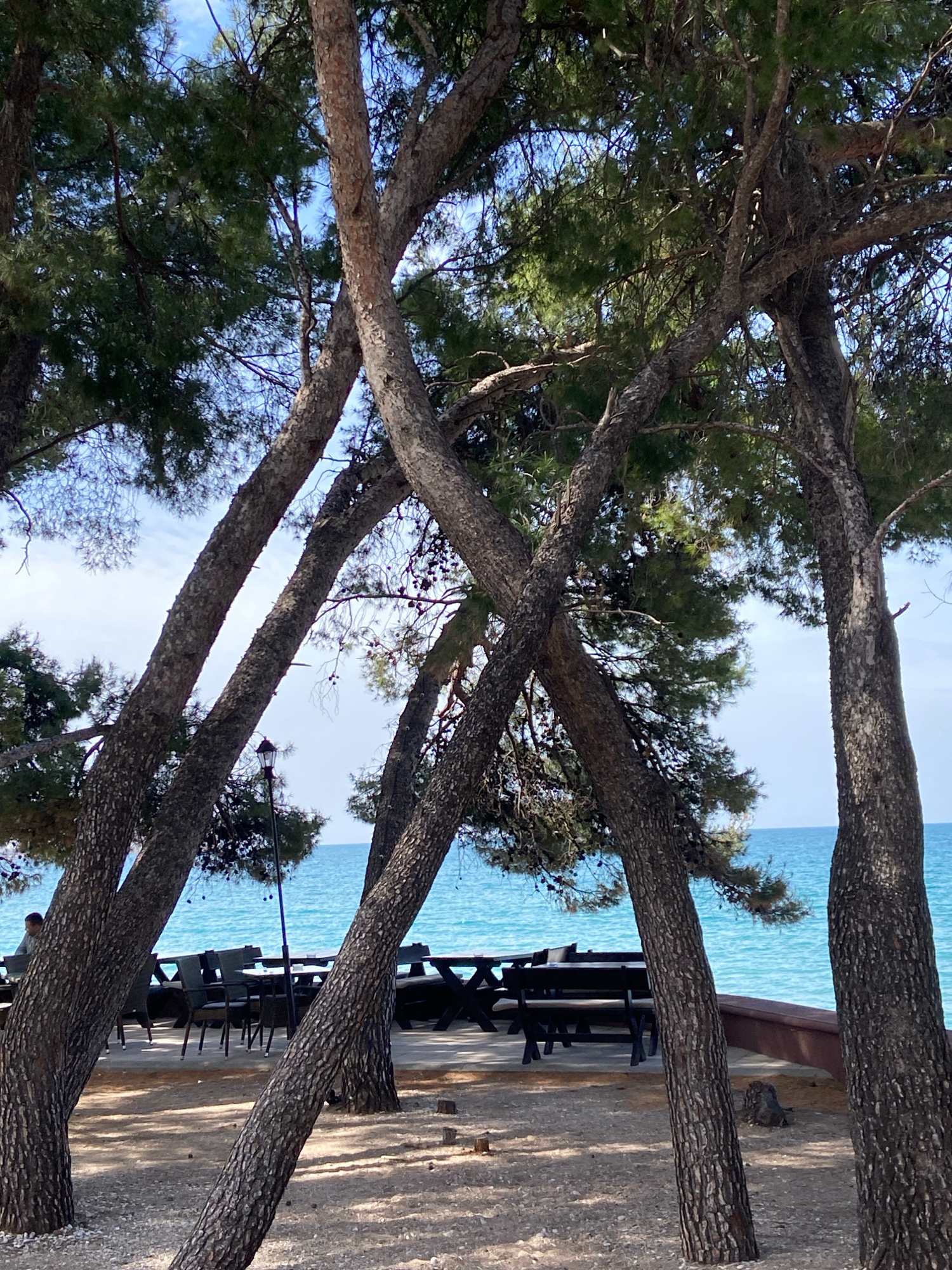 The image shows a seaside view framed by tree trunks in the city of Bar, Montenegro. The tree trunks are dark brown with textured bark and are oriented vertically in the image, obscuring parts of the…read more