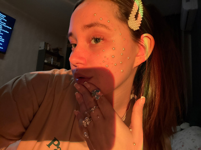 A fair-skinned person poses with their head tilted. They are adorned with small, pearl-like embellishments on their face. Their fingers, laden with rings, are positioned near their mouth. A pearl-deco…read more