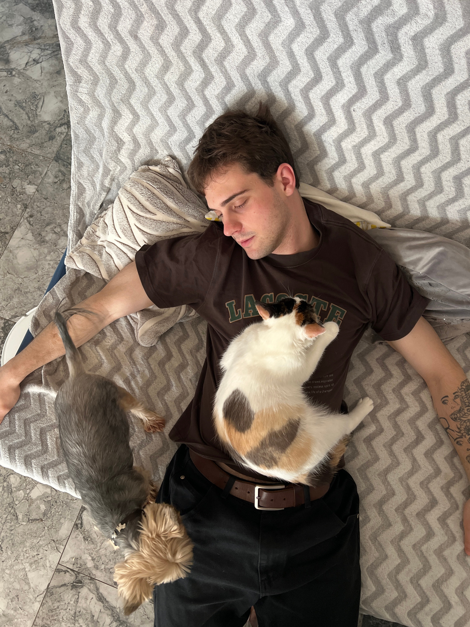 A fair-skinned man with dark hair lies on a gray zigzag patterned blanket. He wears a brown t-shirt, black pants, and a brown leather belt. A calico cat lies on his torso. A small gray and tan dog lie…read more