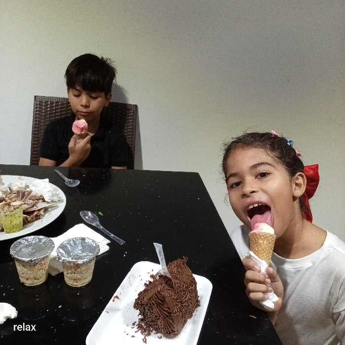 A boy and girl sit at a black table enjoying desserts. The boy holds a pink ice cream treat, looking contemplative. The girl excitedly licks a cone of ice cream, her mouth wide open. In front of them,…read more