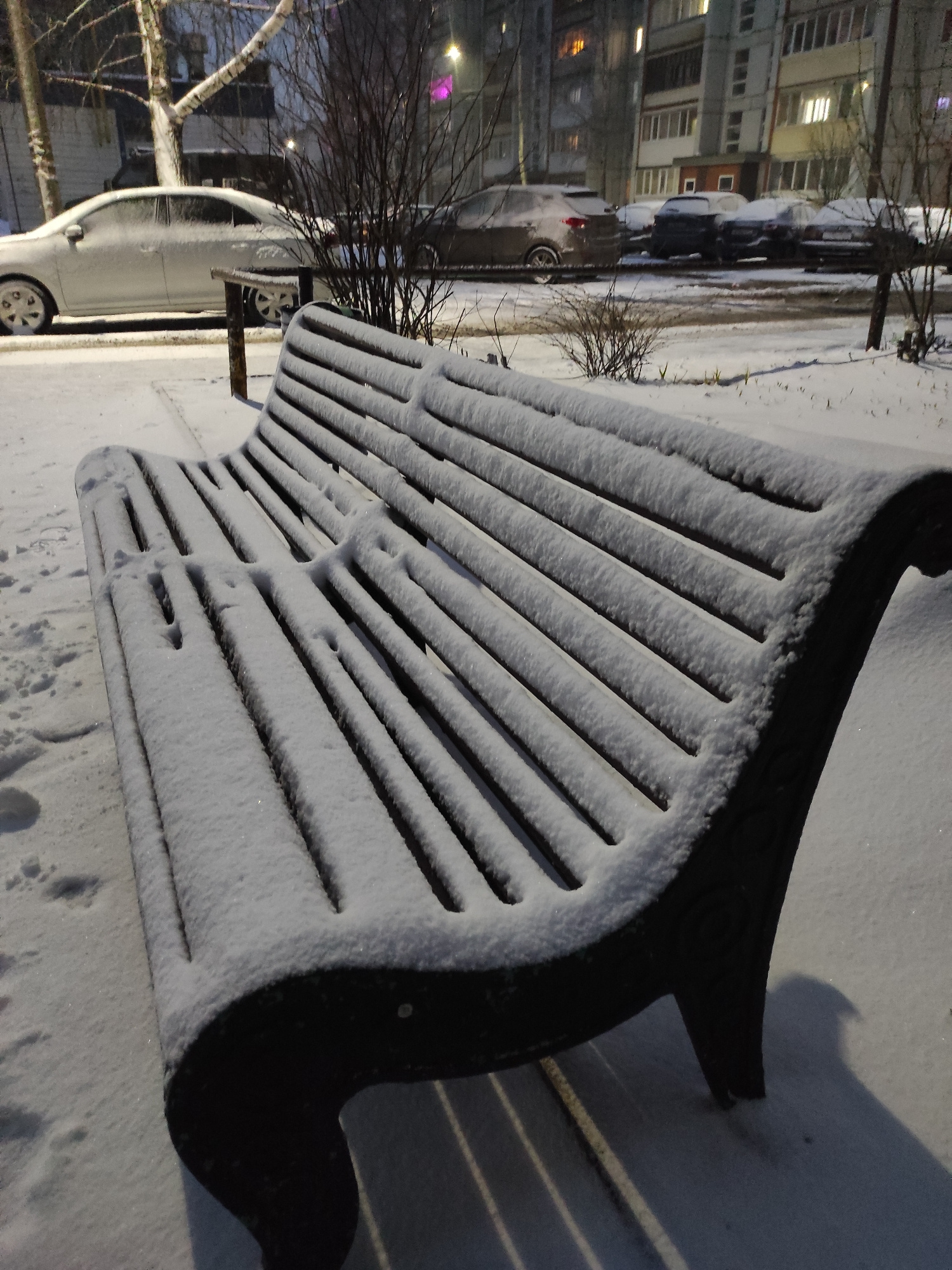 The image depicts a snow-covered park bench in what appears to be a residential area in Chaikovsky, Russia. The bench is made of dark metal and wood slats, heavily layered with fresh snow. In the back…read more