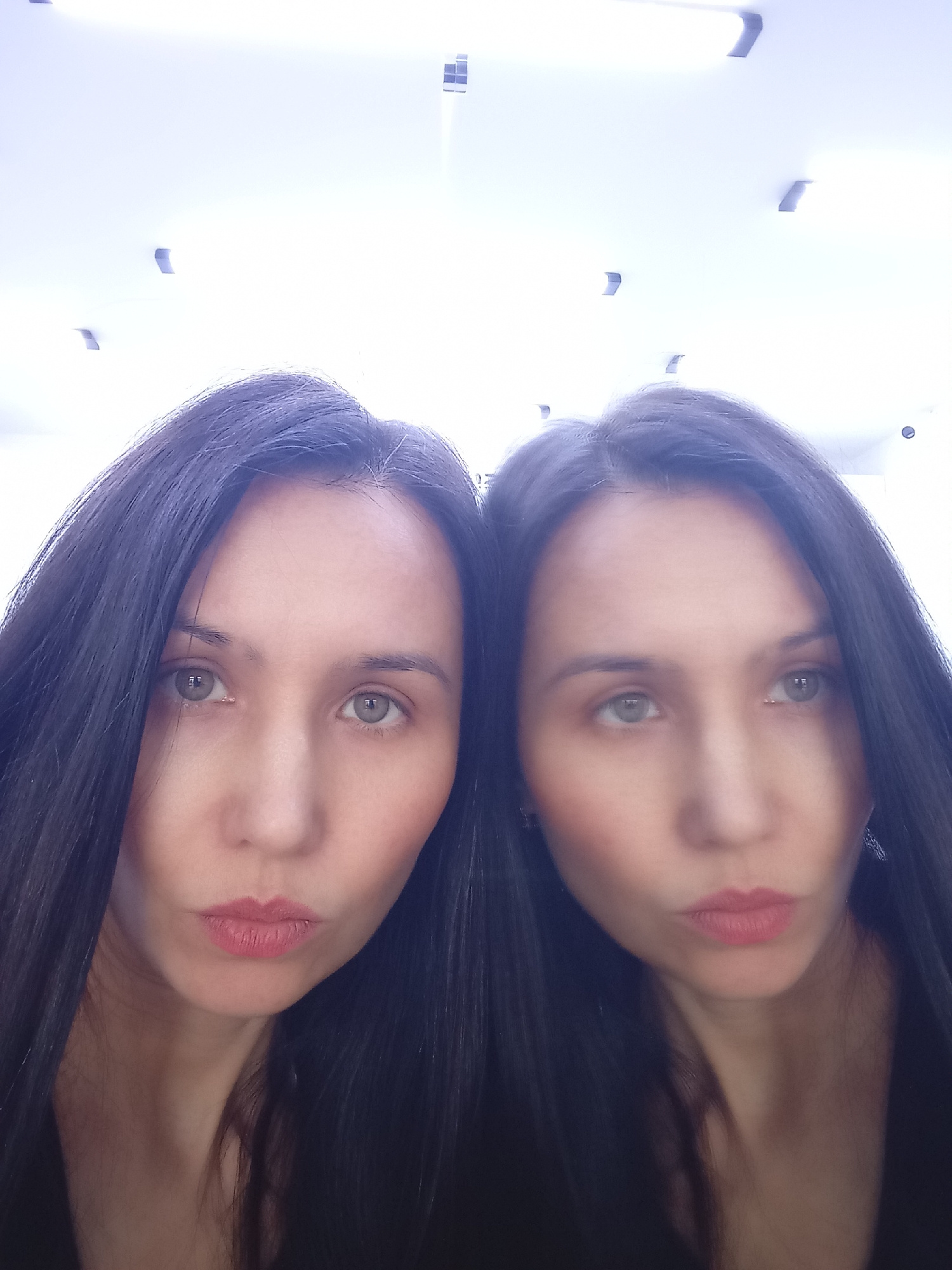 A woman with long, dark hair and fair skin is seen in a close-up selfie or reflection, possibly in a mirrored surface, creating a duplicate image of herself. Her lips are slightly pursed. She is weari…read more