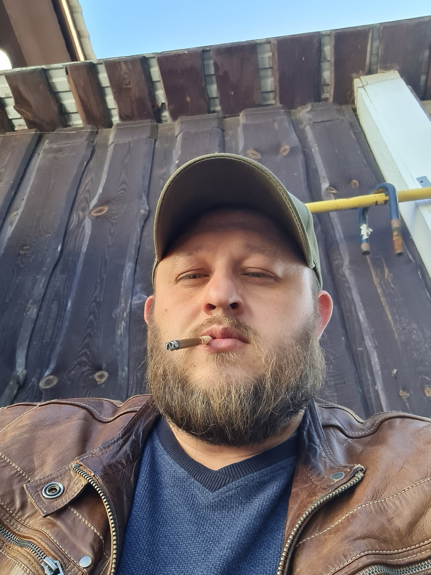 A bearded man wearing a brown leather jacket and a green baseball cap is shown smoking a cigarette. The man's eyes are partially closed. The background appears to be a wooden building with a blue sky…read more