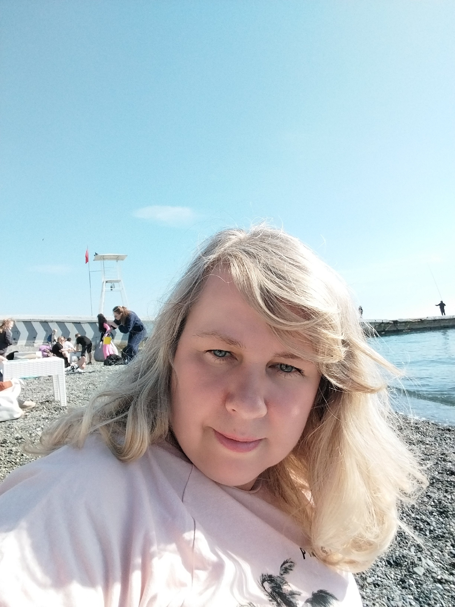 A young woman with long, wavy blonde hair and blue eyes is prominently featured in the foreground of this outdoor photograph, taking a selfie. She has a slight, gentle smile on her face and is looking…read more