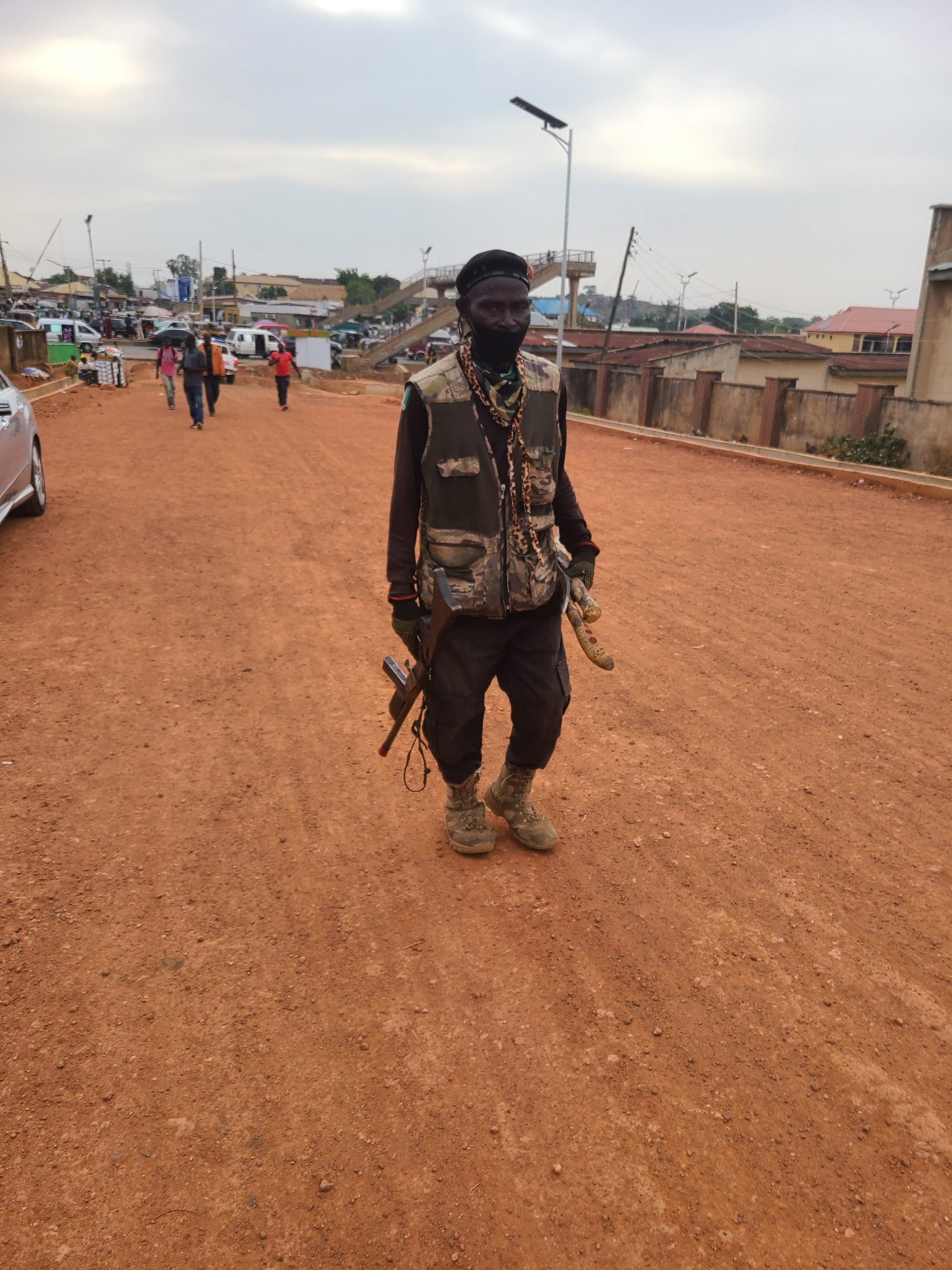 An outdoor, eye-level shot captures a person standing on reddish-brown earth, characteristic of laterite soil, in what appears to be an urban or semi-urban setting in Jos, Nigeria. The main subject, p…read more