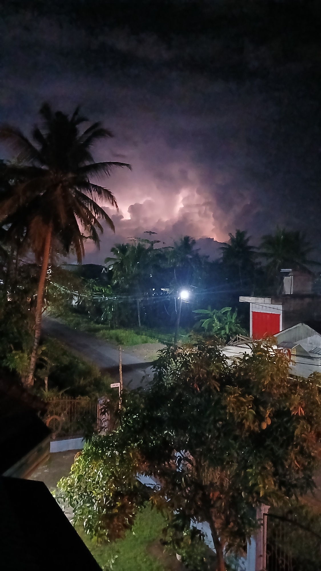 The image shows a night scene in Lhokseumawe, Indonesia during what appears to be a lightning storm. Dark, heavy clouds fill the sky, illuminated by the flashes of lightning. In the foreground, a tall…read more