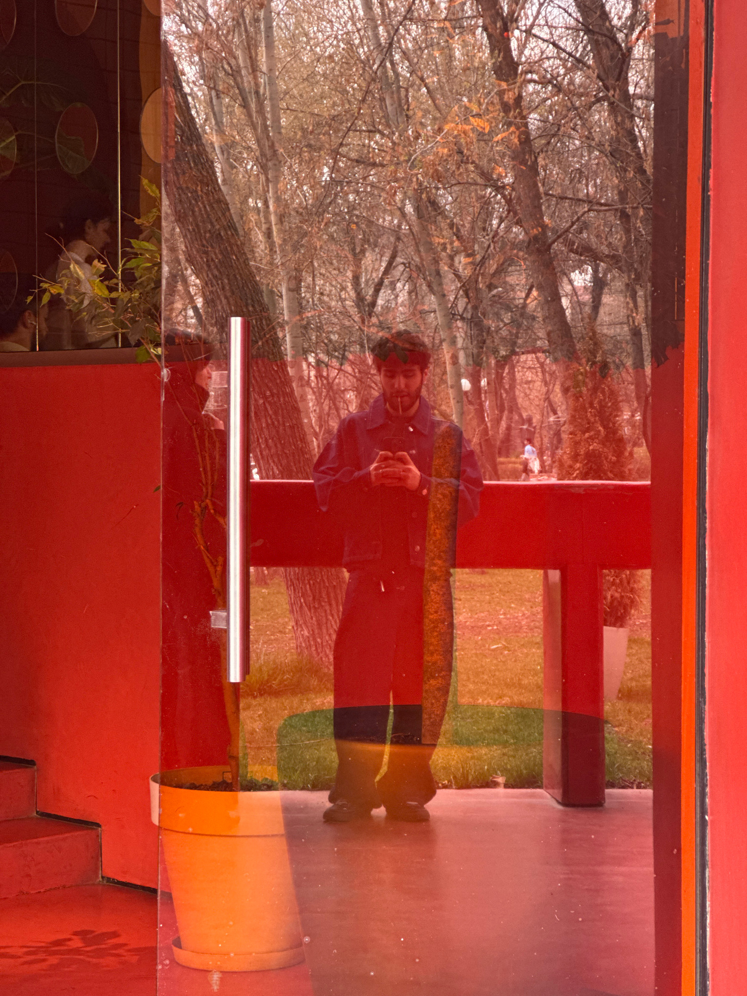The image depicts a complex scene viewed through a red-tinted glass door or window of a building in Yerevan, Armenia, facing a park or wooded area during what appears to be late autumn or winter. In…read more