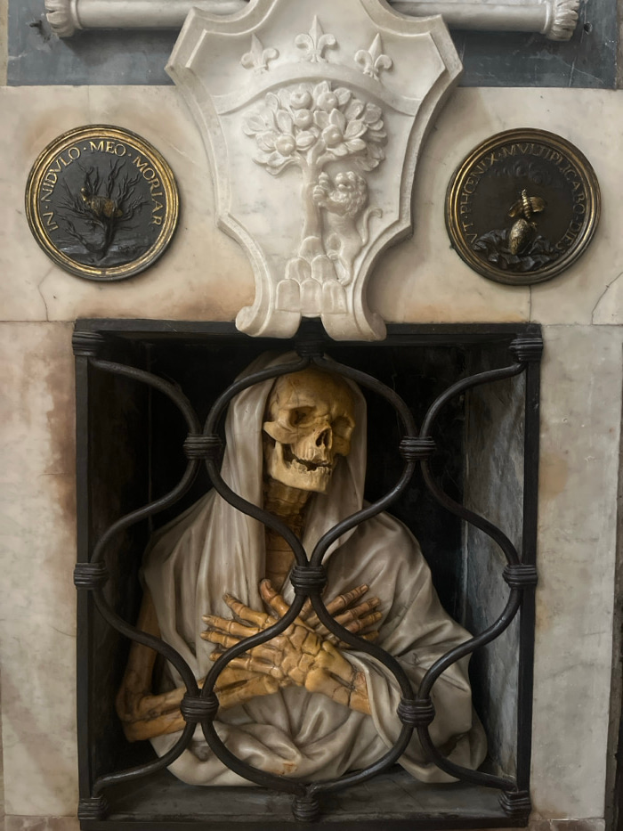 This image depicts the Monument to Cardinal Girolamo Bernerio, located within the Basilica di Santa Maria sopra Minerva in Rome, Italy. The scene presents a funerary monument set into a marble wall.…read more