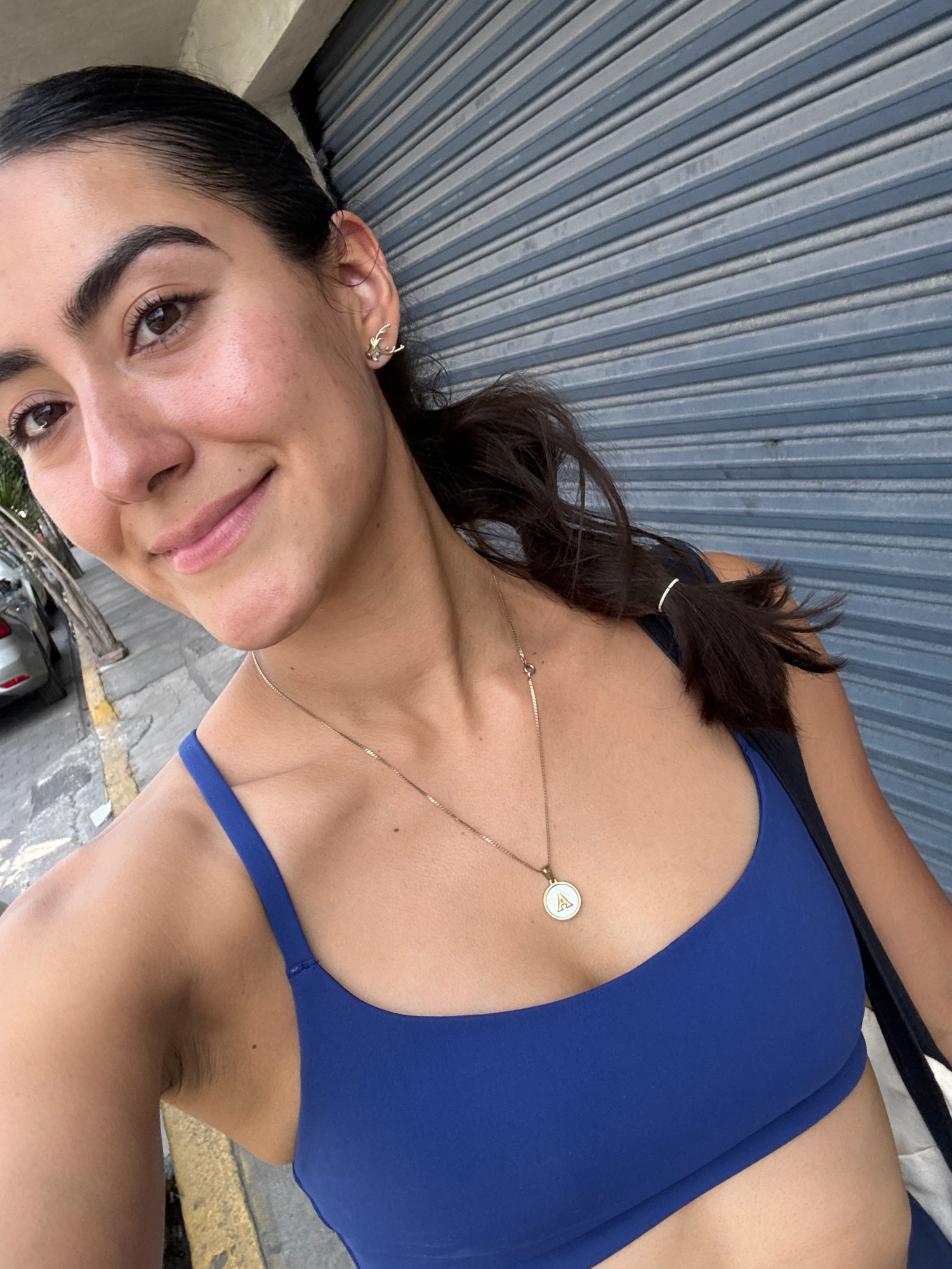 A woman with dark hair, wearing a blue sports bra and a gold necklace, is posing for a picture. She is standing outside in an urban setting, with a textured grey wall behind her. She appears to be in…read more
