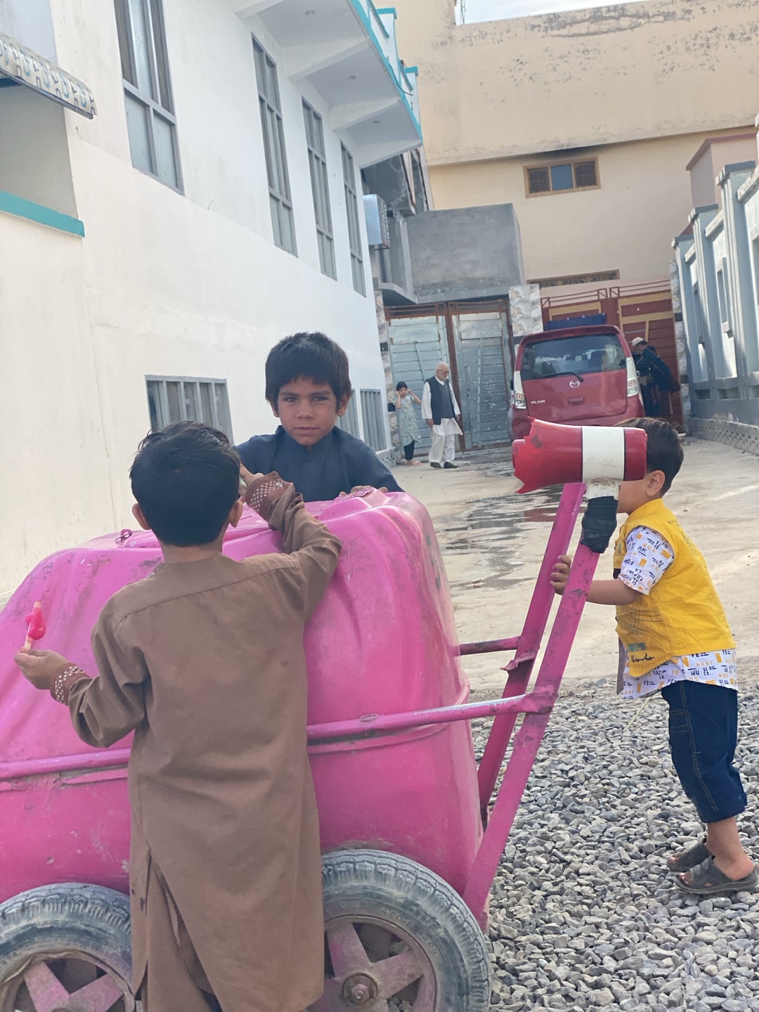 Three boys surround a pink, wheeled cart on a gravel road. One boy, dressed in a brown tunic, stands on the left, holding a pink object. The boy in the center wears a dark shirt and looks directly at…read more