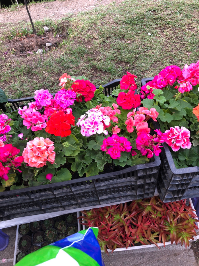 A top-down view shows flowers of various shades of pink, red, and orange in black crates along the right side of a grassy area. The plants display a dense arrangement of green leaves interspersed with…read more