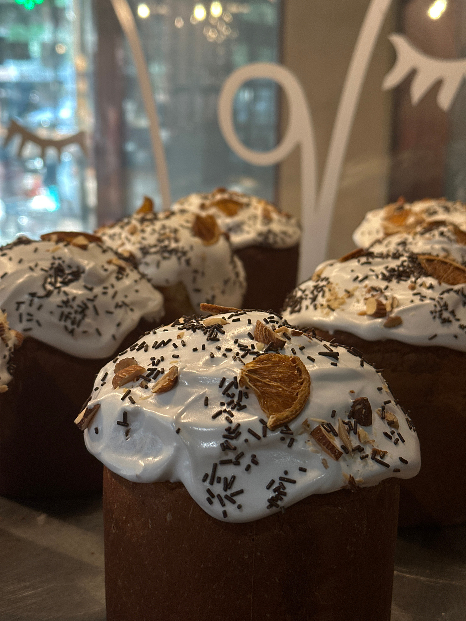 The image displays several Easter breads (likely traditional "kulich") adorned with white icing, chocolate sprinkles, and slices of dried fruit. The bread is displayed behind glass with what appears t…read more