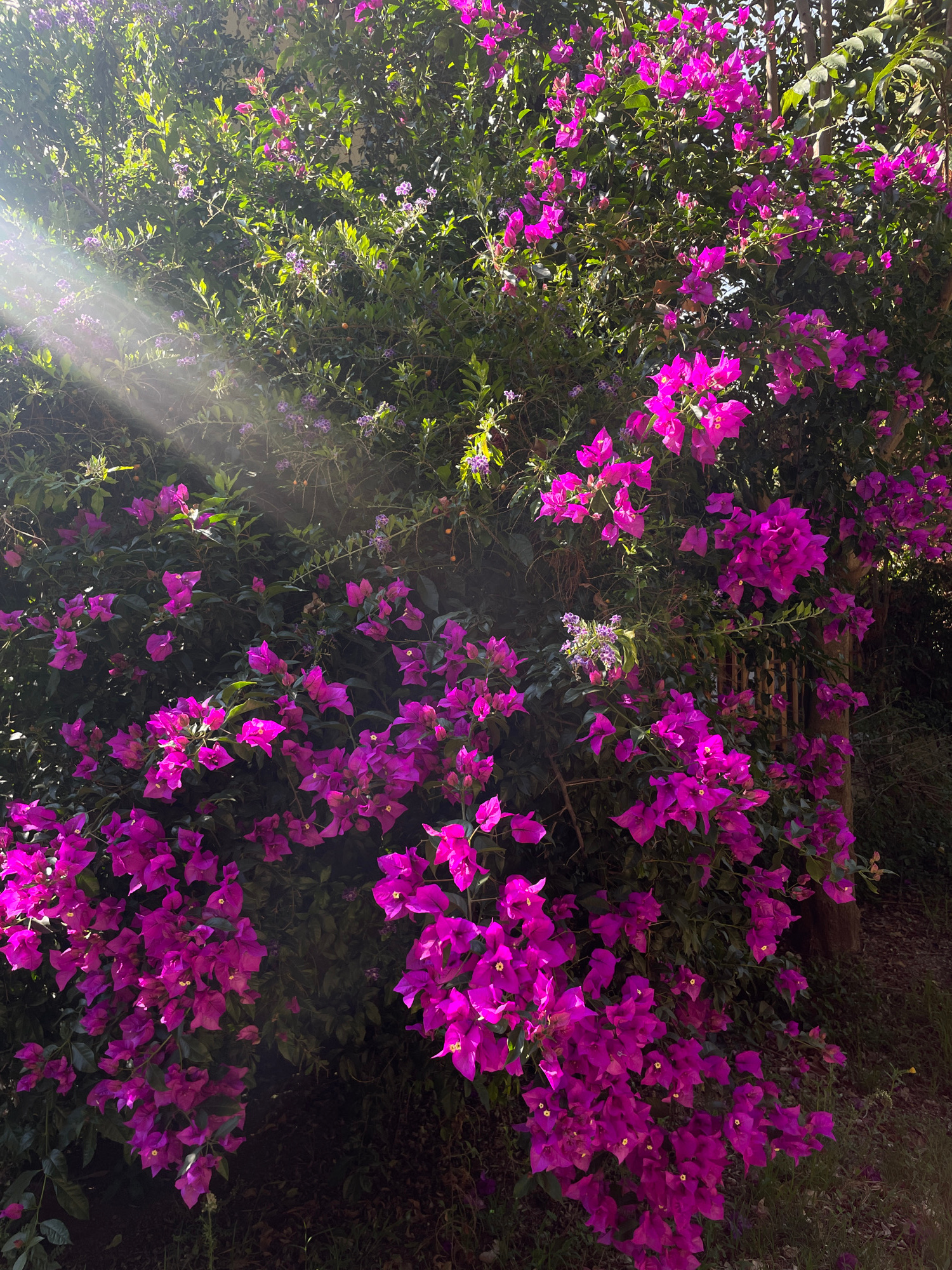 The image shows a close-up view of a bougainvillea bush with vibrant purple flowers and green leaves. Sunlight streams from the bottom left corner, illuminating the foliage. The setting is Cholula, Me…read more