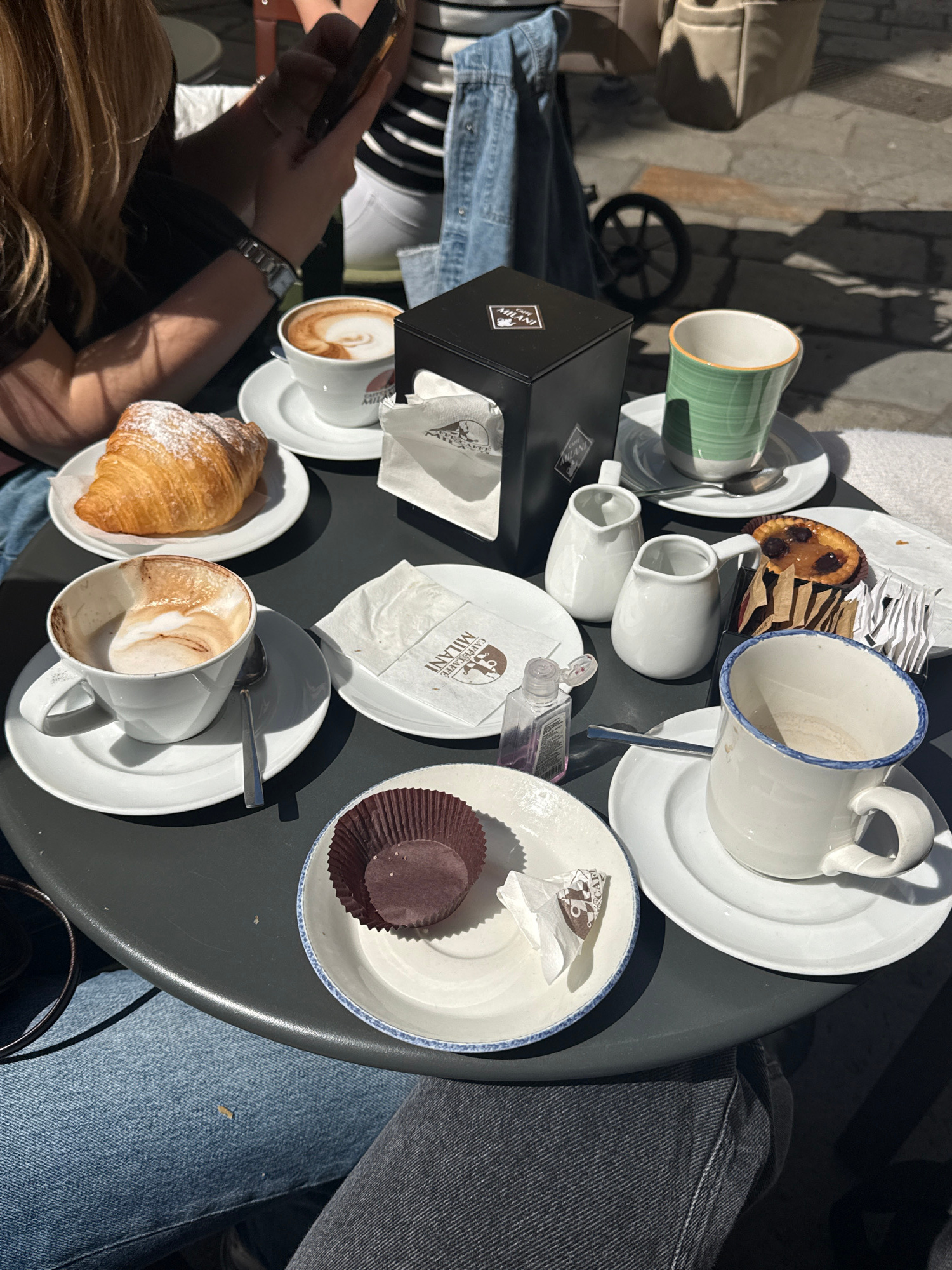 This is a high-angle, slightly rotated shot of a table at an outdoor cafe in Lecco, Italy, bathed in bright sunlight. The scene depicts a relaxed gathering, likely for coffee and pastries. On a dark…read more