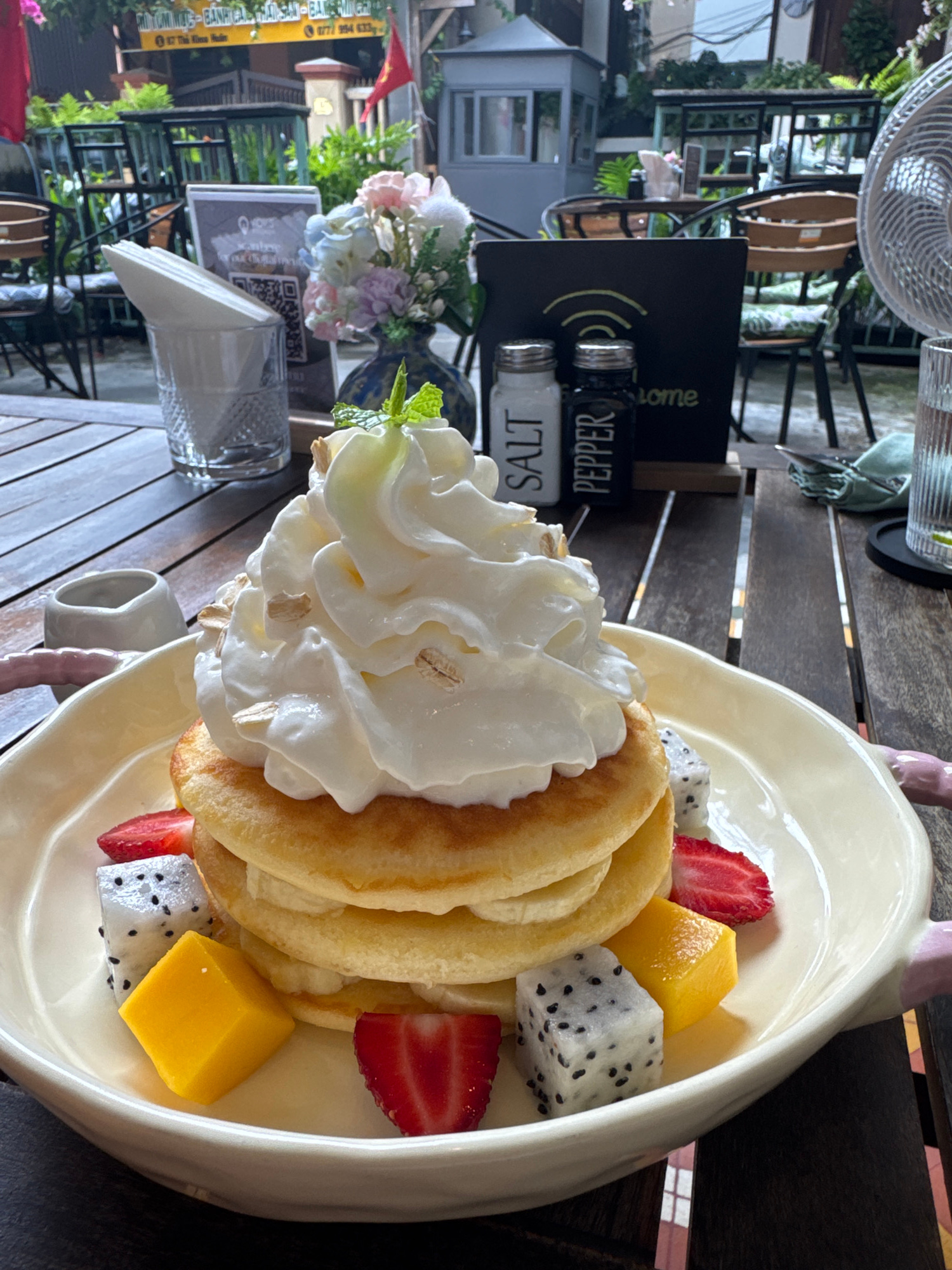 The image depicts a plate of pancakes with whipped cream, strawberries, mango, and dragon fruit, likely photographed at a cafe in Đà Nẵng, Vietnam. The pancakes are stacked and topped with a generous…read more