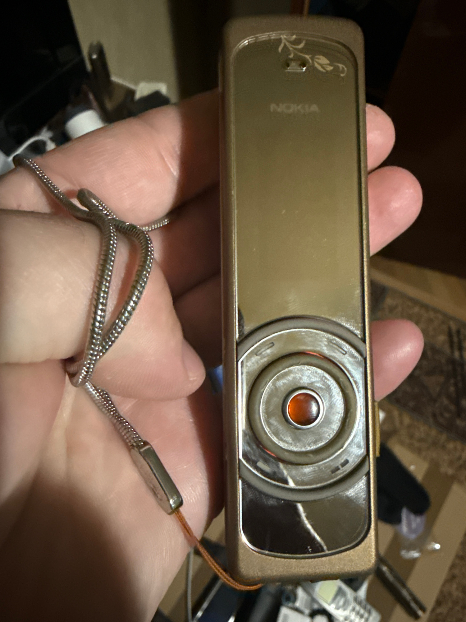 The image displays a person's hand holding a golden-bronze Nokia mobile phone horizontally. The phone features a decorative etched floral design on its left side and the "NOKIA" brand name. The right…read more