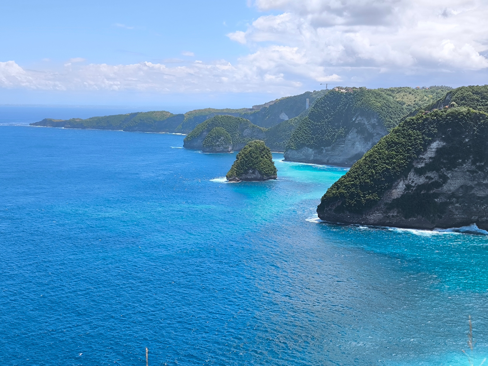 This is an outdoor, wide-angle shot of the coastline of Nusa Penida, Indonesia, under a partly cloudy sky. The blue ocean occupies most of the scene, with its surface showing a wave pattern. A chain o…read more