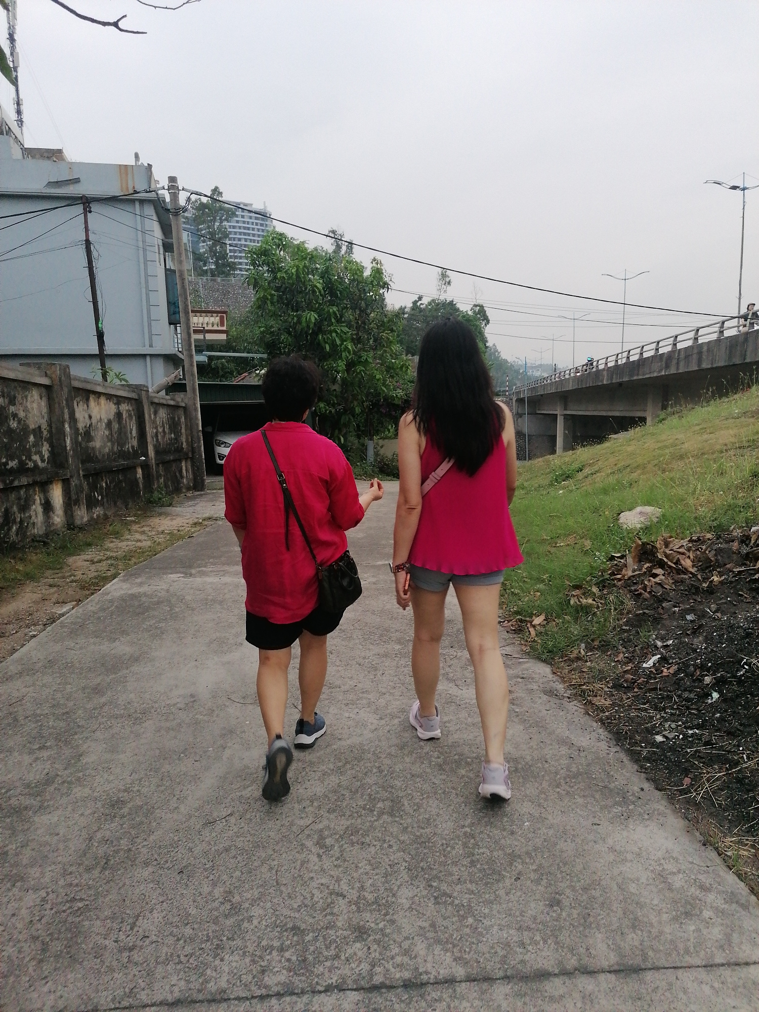 Two women are walking away from the viewer on a concrete pathway. The woman on the left is wearing a red shirt, black shorts, and dark sneakers, with a black purse slung across her shoulder. The woman…read more