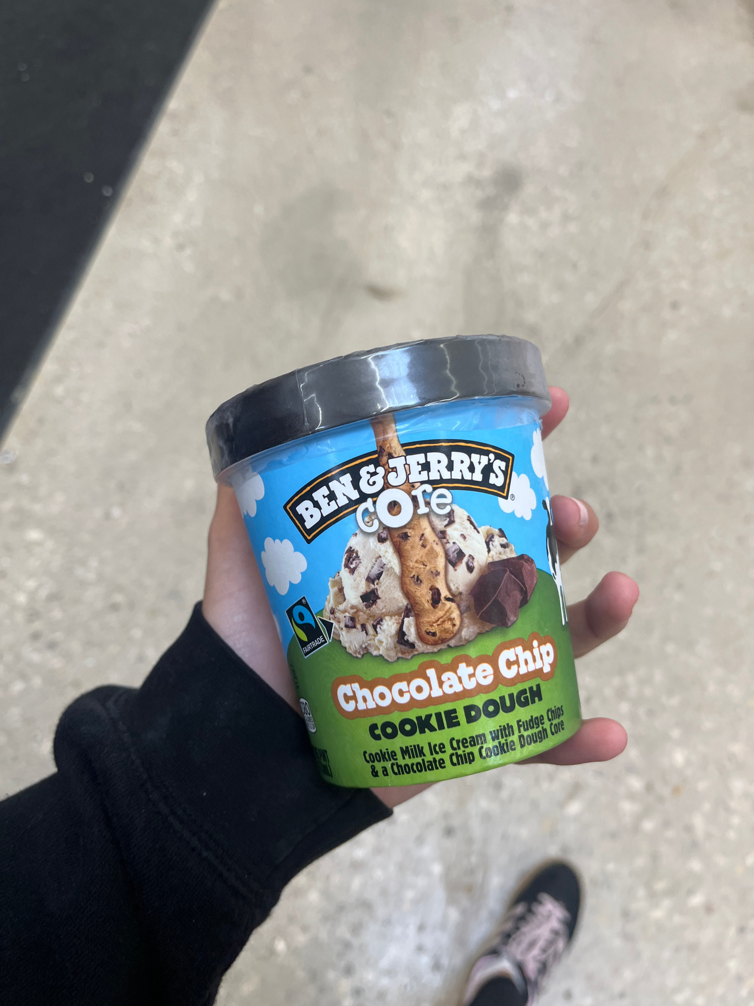 A person is holding a container of Ben & Jerry's "Core Chocolate Chip Cookie Dough" ice cream. The container features a light blue background with white clouds, the Ben & Jerry's logo, an illustration…read more