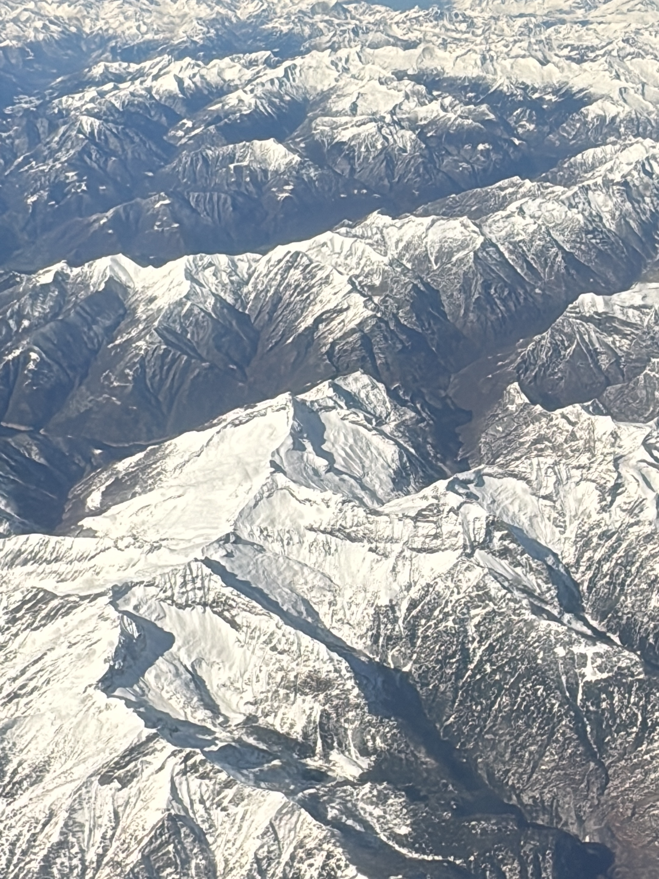The image presents a stunning, high-altitude aerial view of a vast, snow-covered mountain range, likely captured from an airplane. The landscape is dominated by numerous peaks and ridges, all appearin…read more