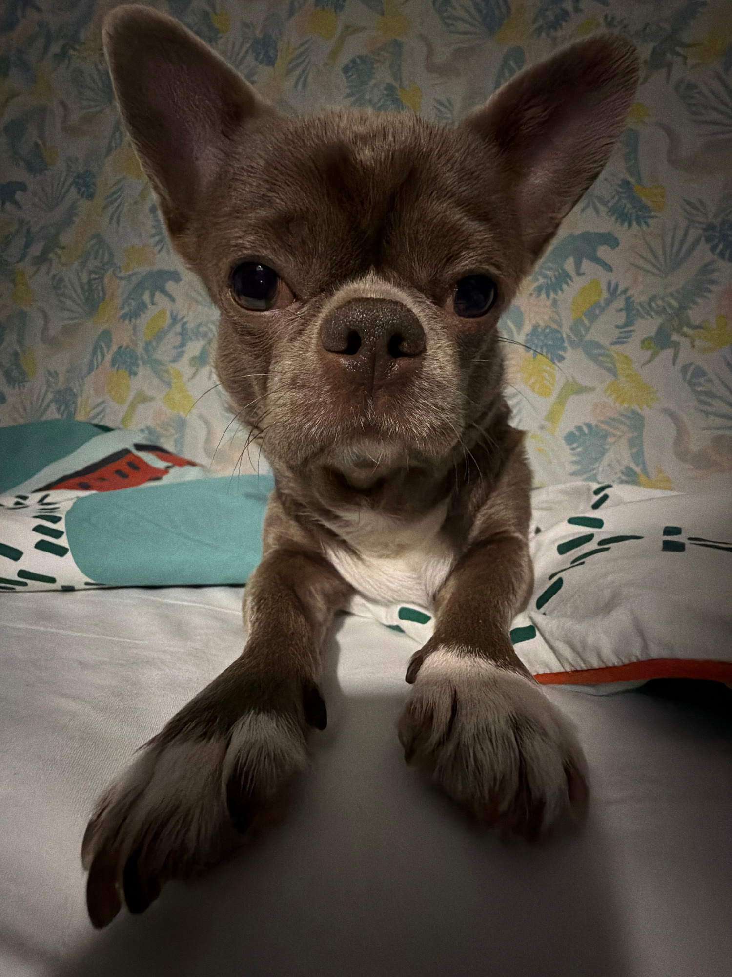 A small brown chihuahua is lying on its back on a bed, looking directly at the camera. The dog is positioned with its head at the left side of the frame and its paws extending towards the right. The b…read more