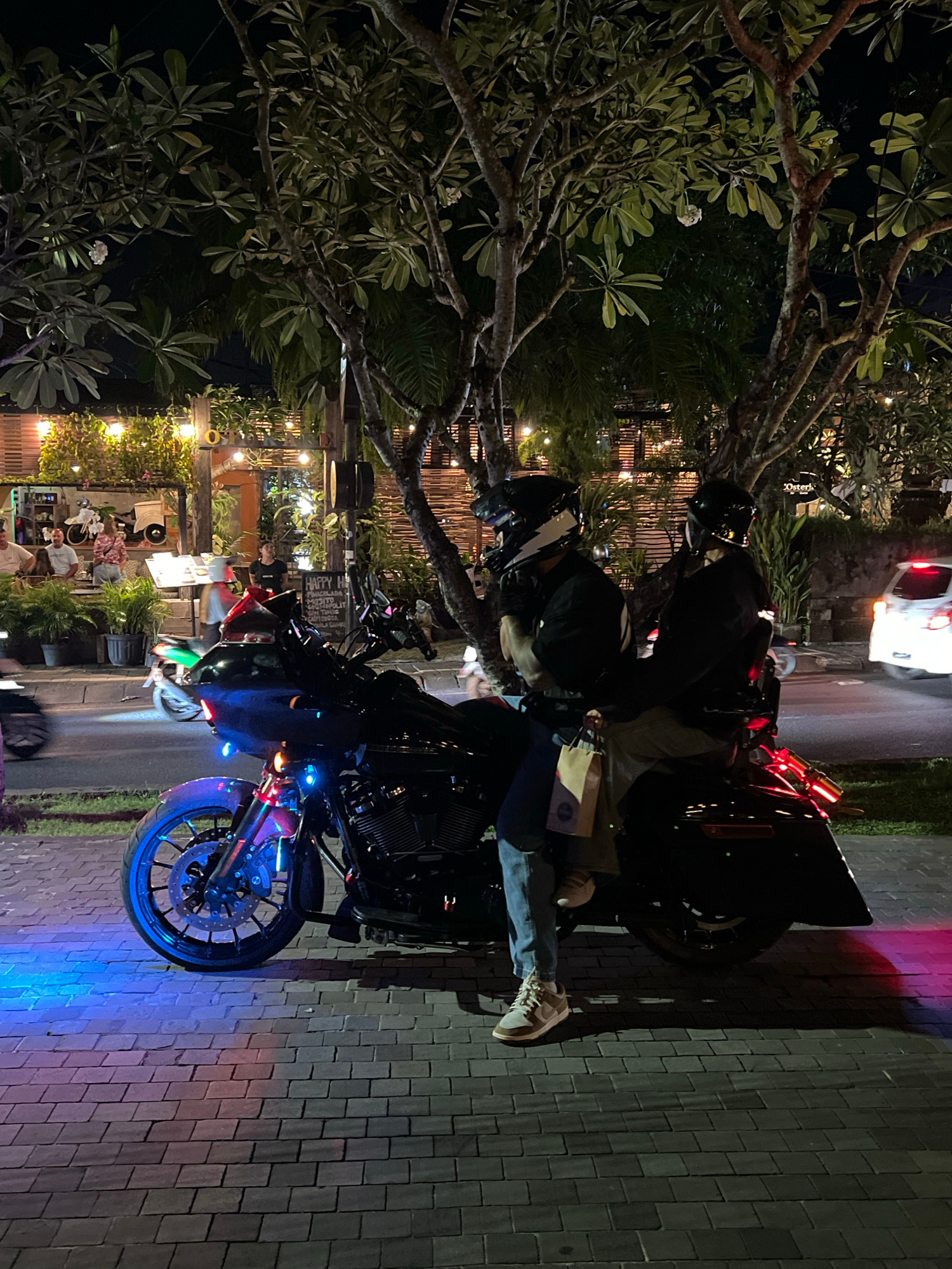Two people are sitting on motorcycles parked on a brick street in front of a restaurant in Ubud, Indonesia, at night. The person on the front motorcycle is looking down, and the motorcycles have color…read more