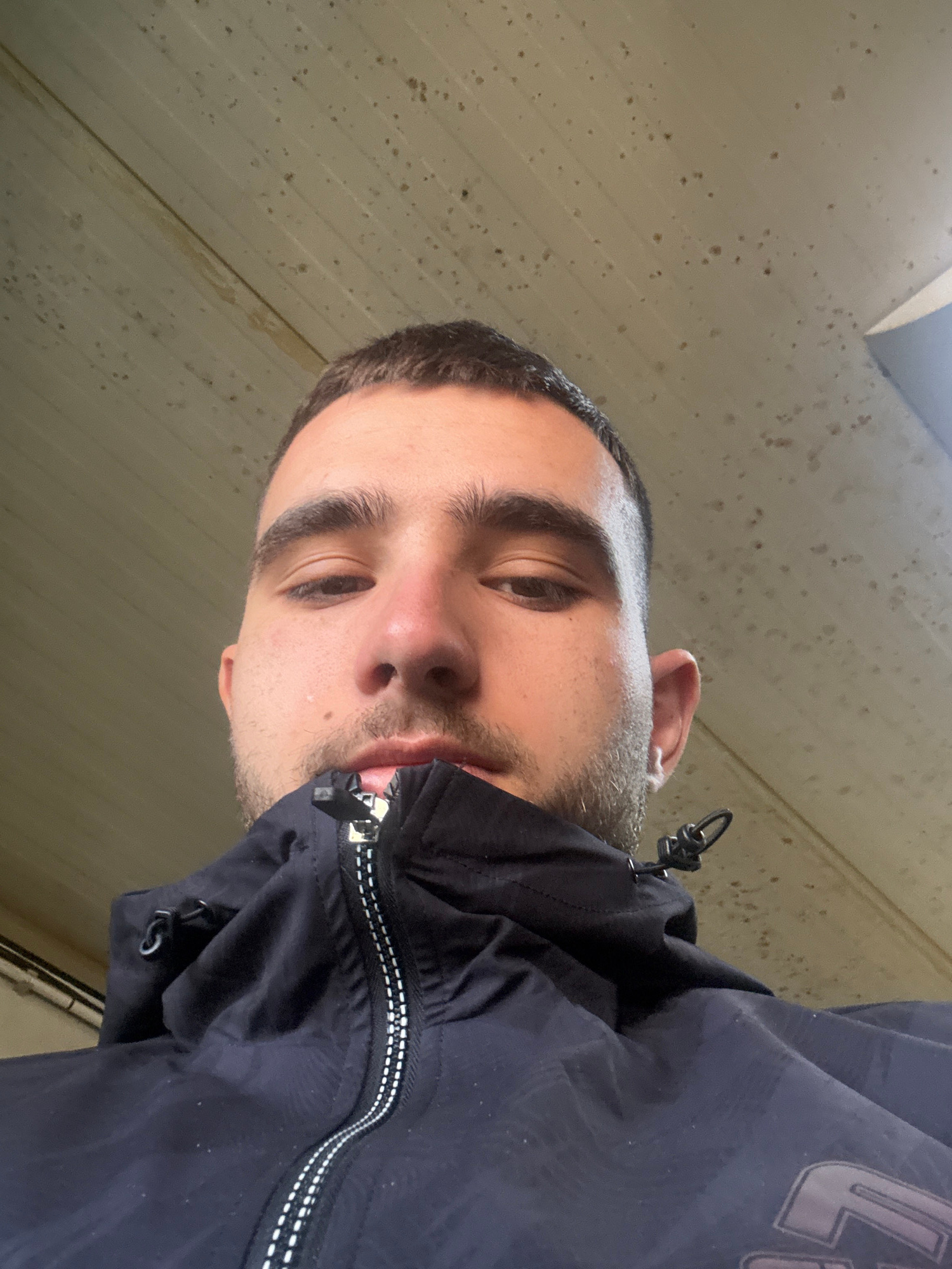 A man with short dark hair and stubble, wearing a dark blue jacket with a white-stitched zipper, is visible in a photograph. The angle suggests the photo was taken from above looking down. The backgro…read more
