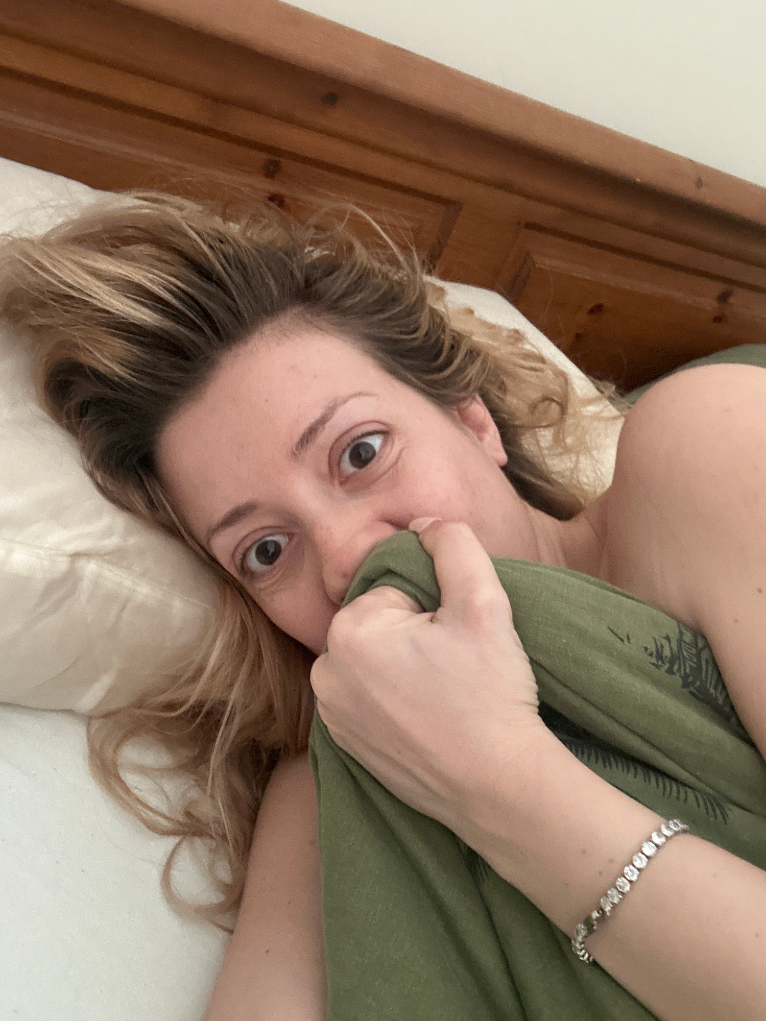 An intimate, angled close-up shot captures a person, likely female, lying down indoors, presumably on a bed in Amsterdam, Netherlands. The subject's head rests on a light-colored pillow, with light br…read more