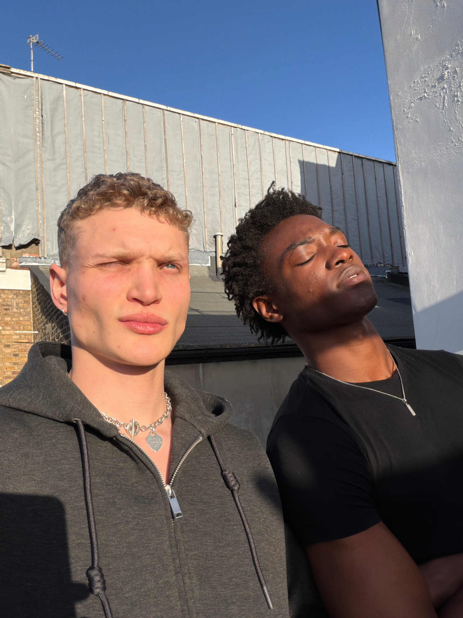 Two young men are posing for a selfie outdoors on a sunny day. The man in the foreground has fair skin, light-colored curly hair, and is wearing a gray zip-up hoodie and a silver chain necklace with a…read more