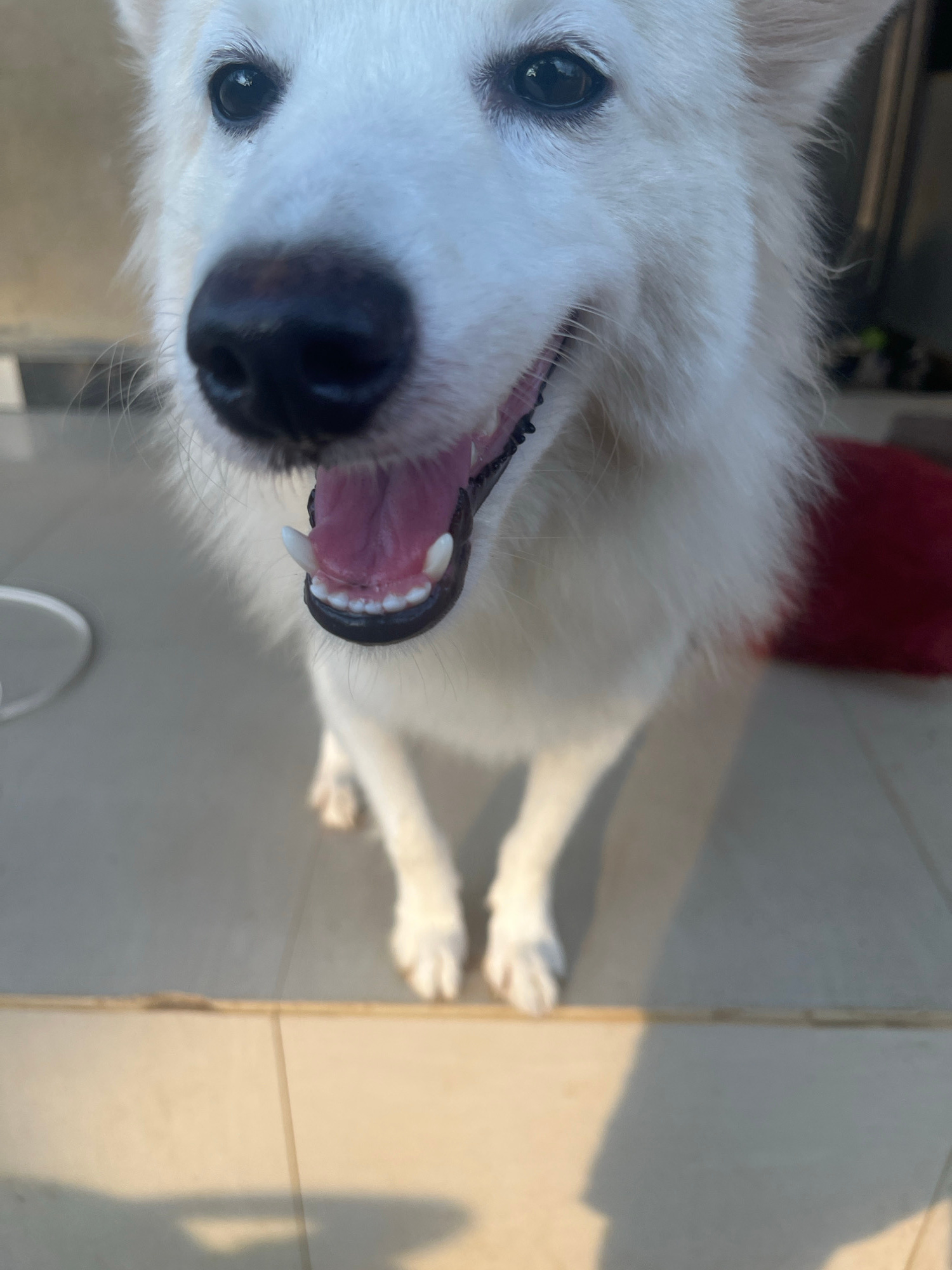 A close-up, slightly downward-facing image shows a white dog with its mouth open, revealing its teeth. The dog's black nose and dark eyes are clearly visible. The dog is standing on a tiled floor indo…read more