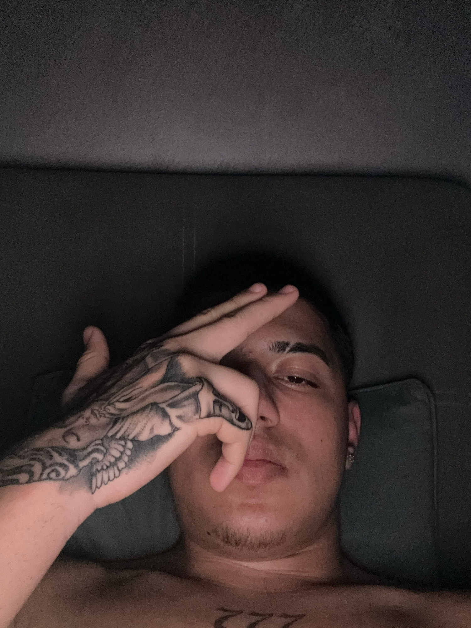 A person is lying on a grey upholstered surface. The person has short dark hair, brown eyes, and light brown skin. The person's right hand is raised to their face with their fingers partially covering…read more