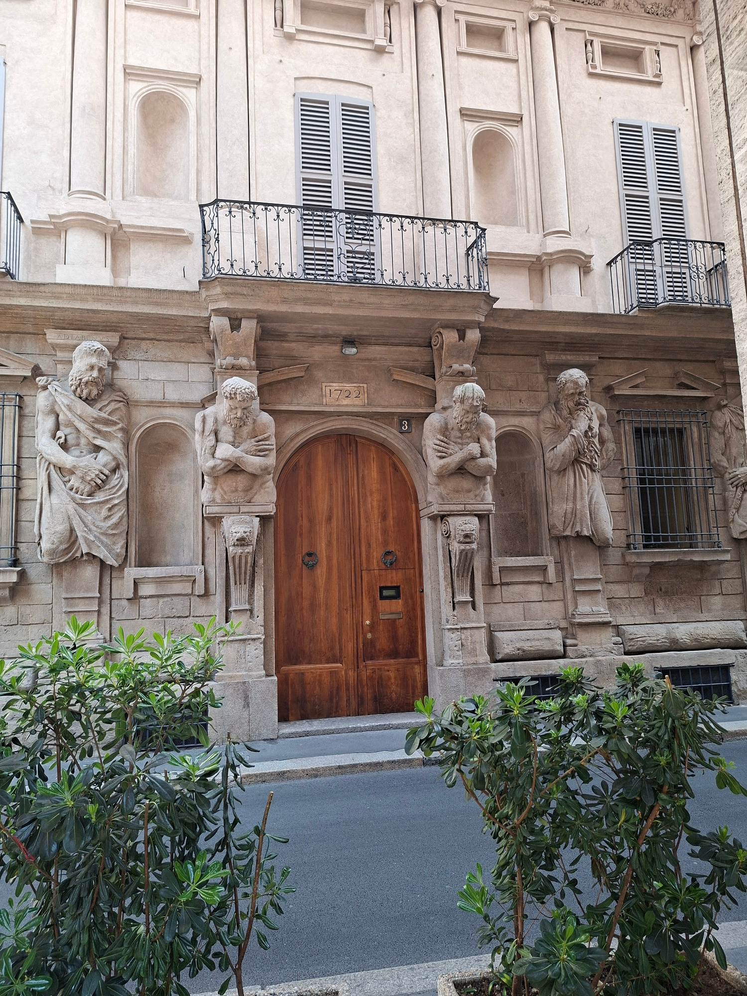 The image captures a building facade in Milan, Italy, with a prominent wooden door flanked by stone sculptures of reclining figures. The facade is detailed with ornate stonework, including a barred wi…read more