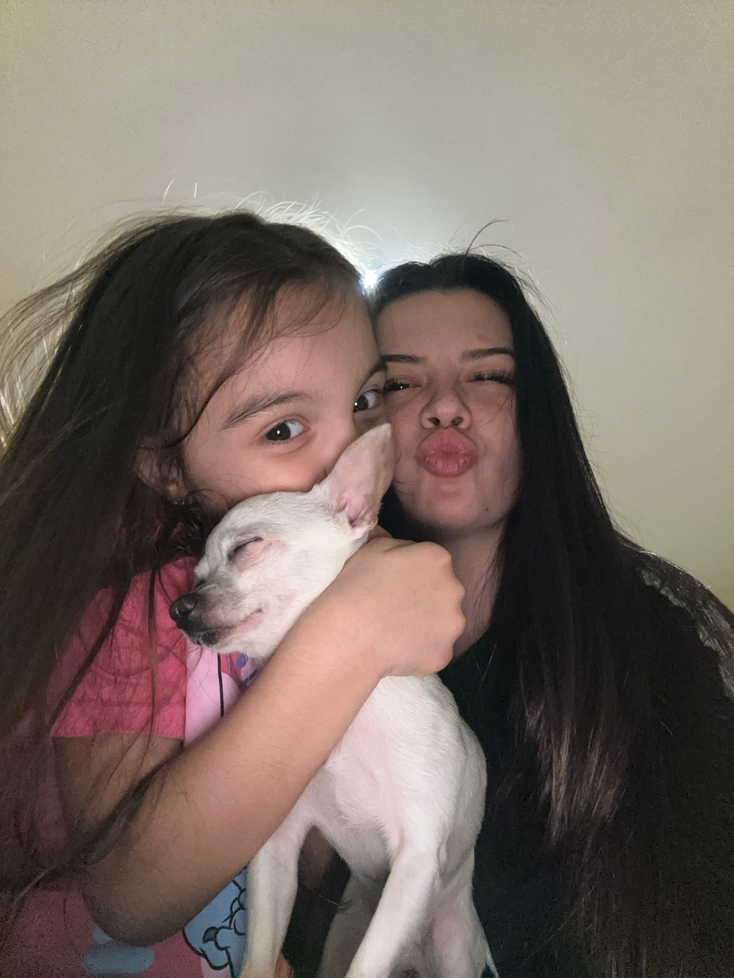Two females and a dog are present in the image. The adult female has long, dark hair and is making a kissing face. The child has long, dark hair and is looking at the camera. The dog is white and is b…read more