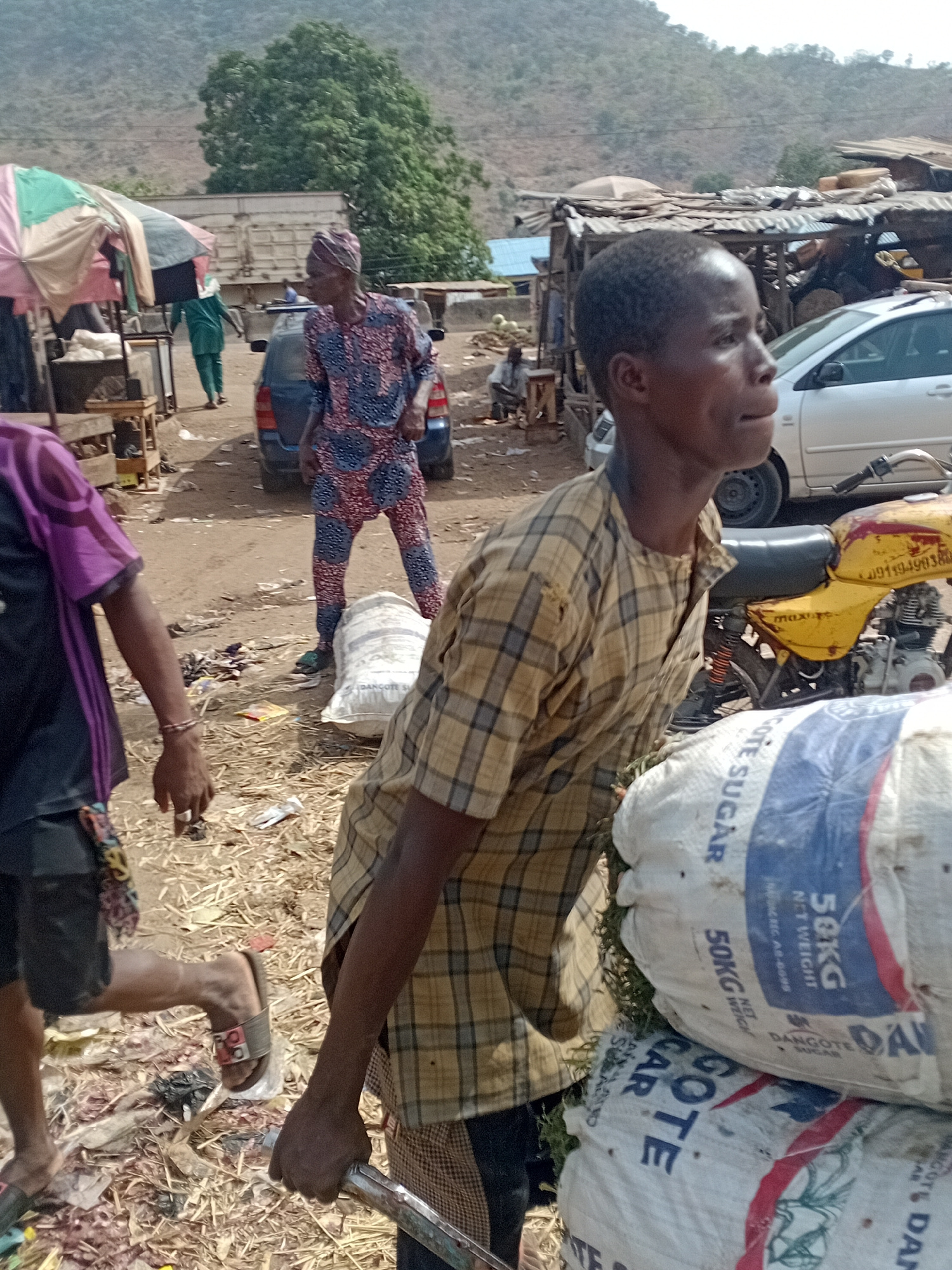 The image depicts an outdoor scene in Lokoja, Nigeria, exhibiting signs of commercial activity and potential junkyard elements. A man in a plaid shirt stands in the foreground, looking upwards. To his…read more