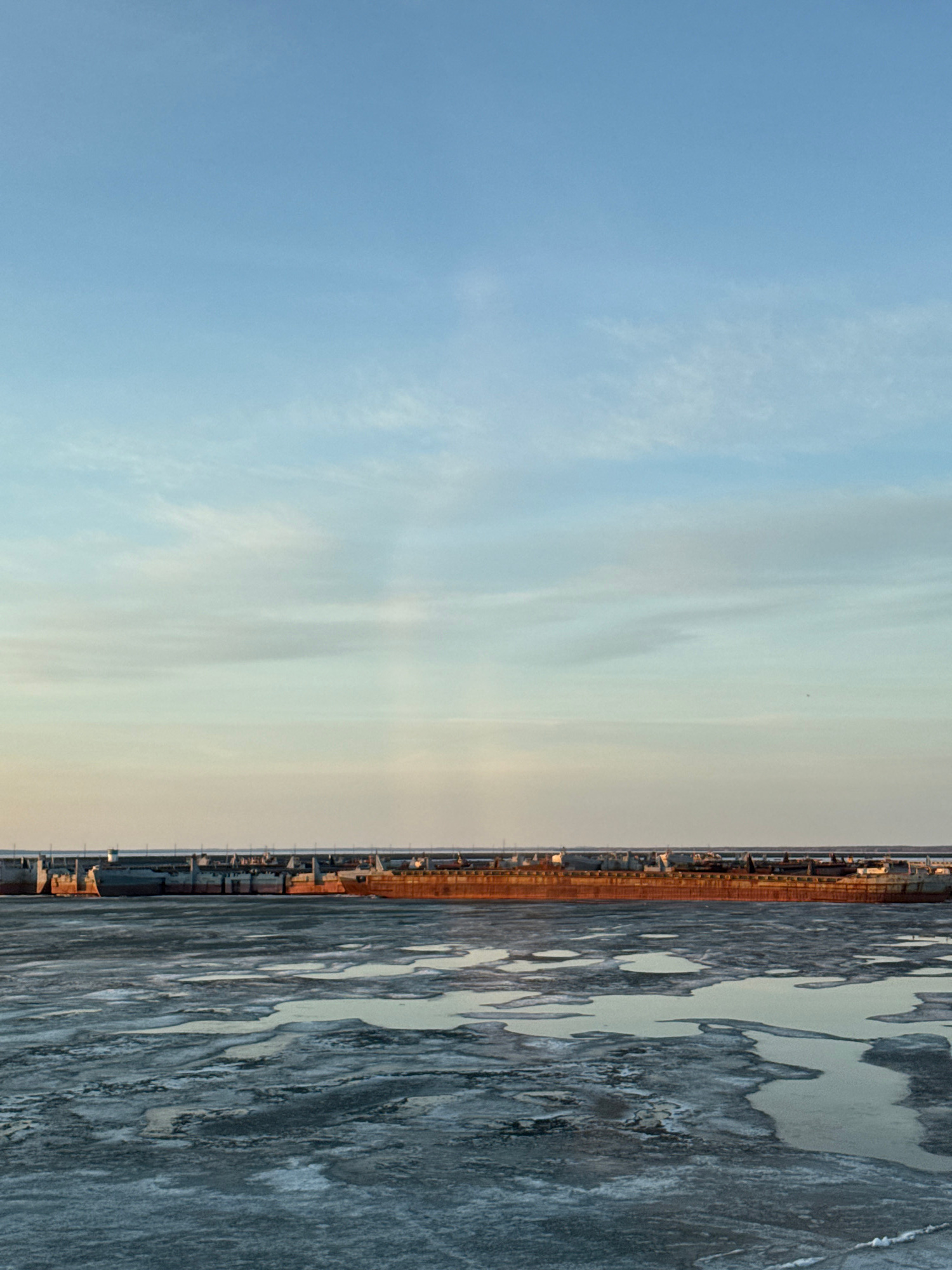 This landscape image depicts a vast winter scene under a clear sky. The upper two-thirds of the frame are filled with the sky, which transitions from a deeper blue at the top to a lighter, warmer paleβ¦read more