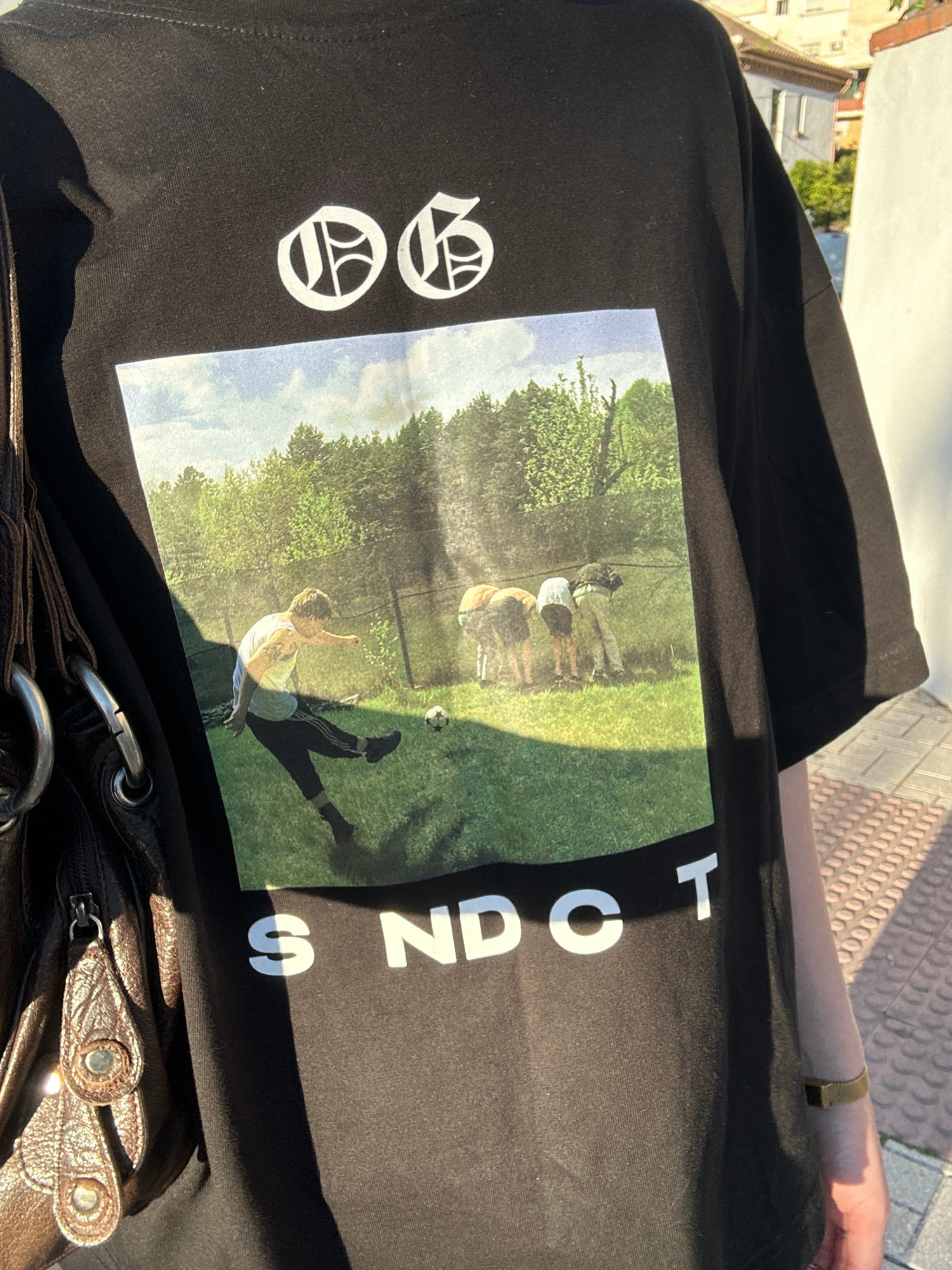 The image shows a black t-shirt with a rectangular print. The print depicts a pasture with sheep, a person kicking a soccer ball, and trees. To the left of the print are two stacked circular symbols.…read more