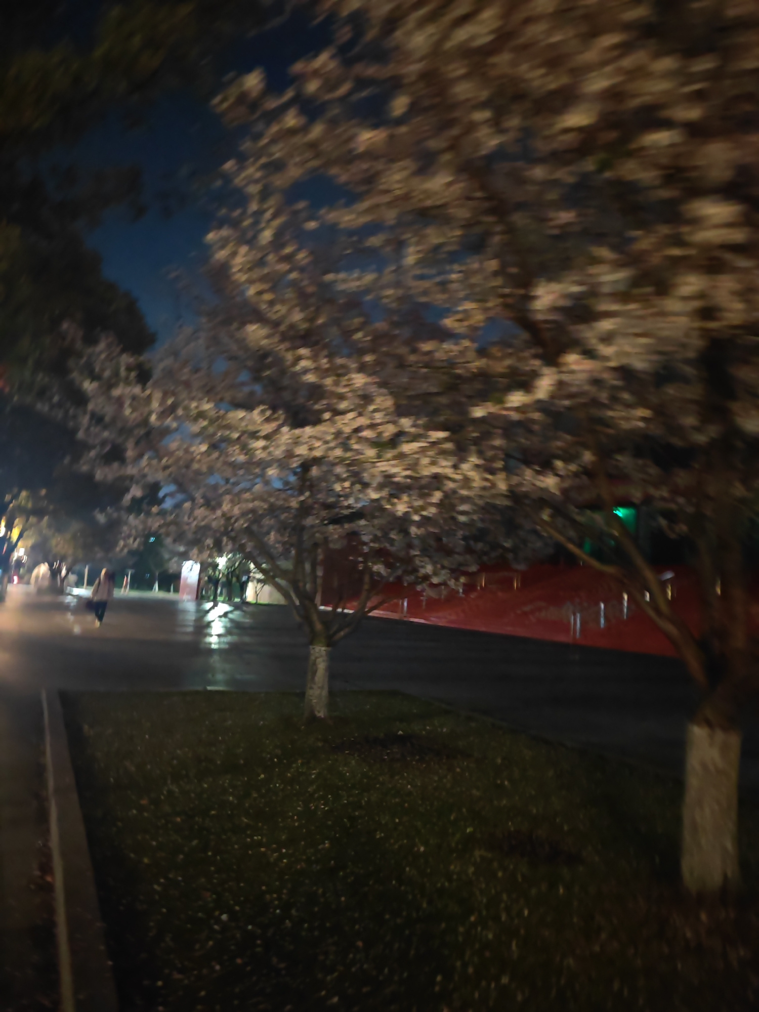 The image depicts a nighttime scene in what appears to be a park or garden in Jiangning District, China. Cherry blossom trees are in full bloom, their white flowers contrasting with the dark sky. A we…read more