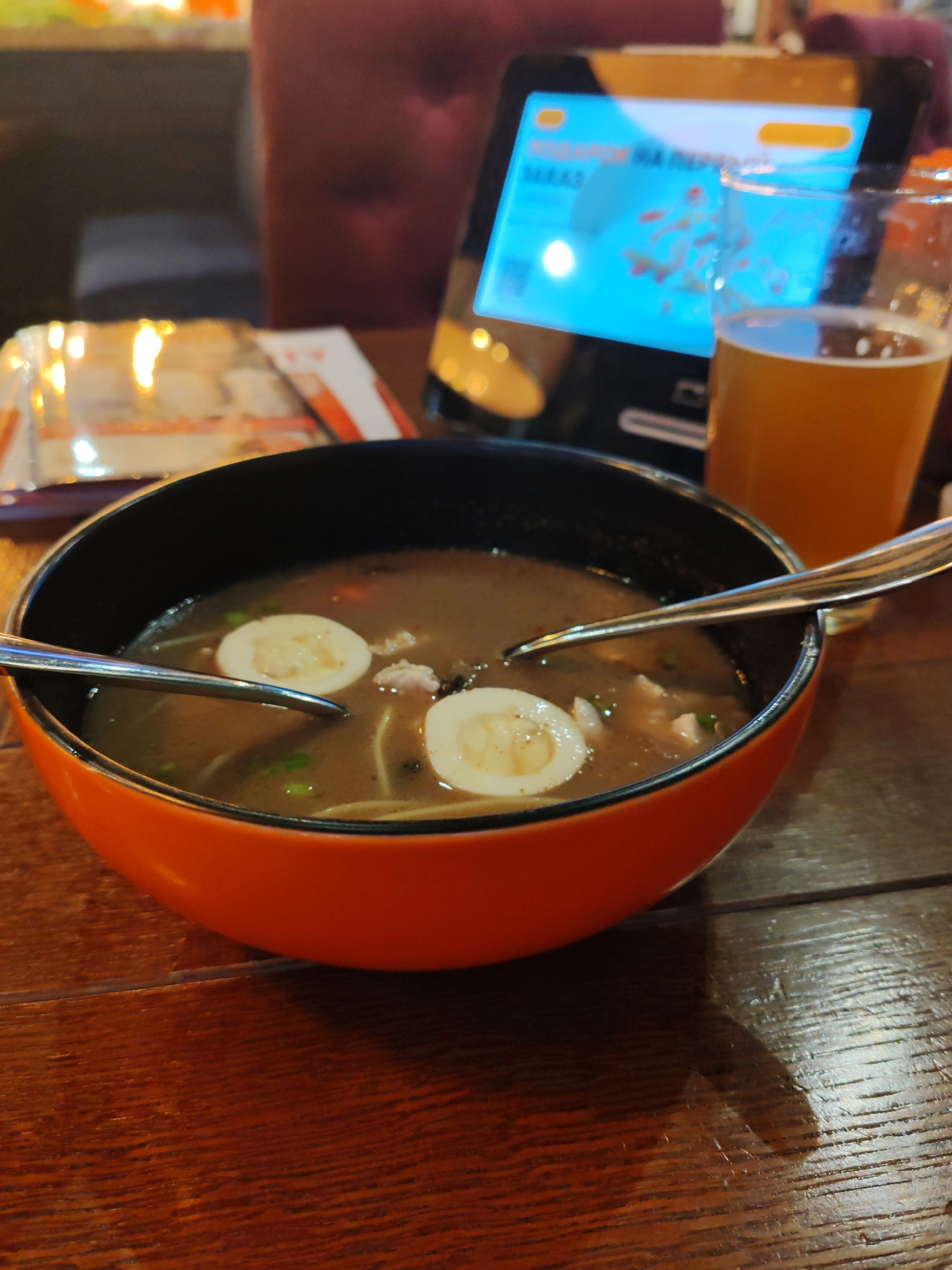 The image captures an indoor dining scene, likely in a restaurant or cafe in Saint Petersburg, Russia, during the evening. In the foreground, a vibrant orange and black bowl holds a hearty soup, resem…read more