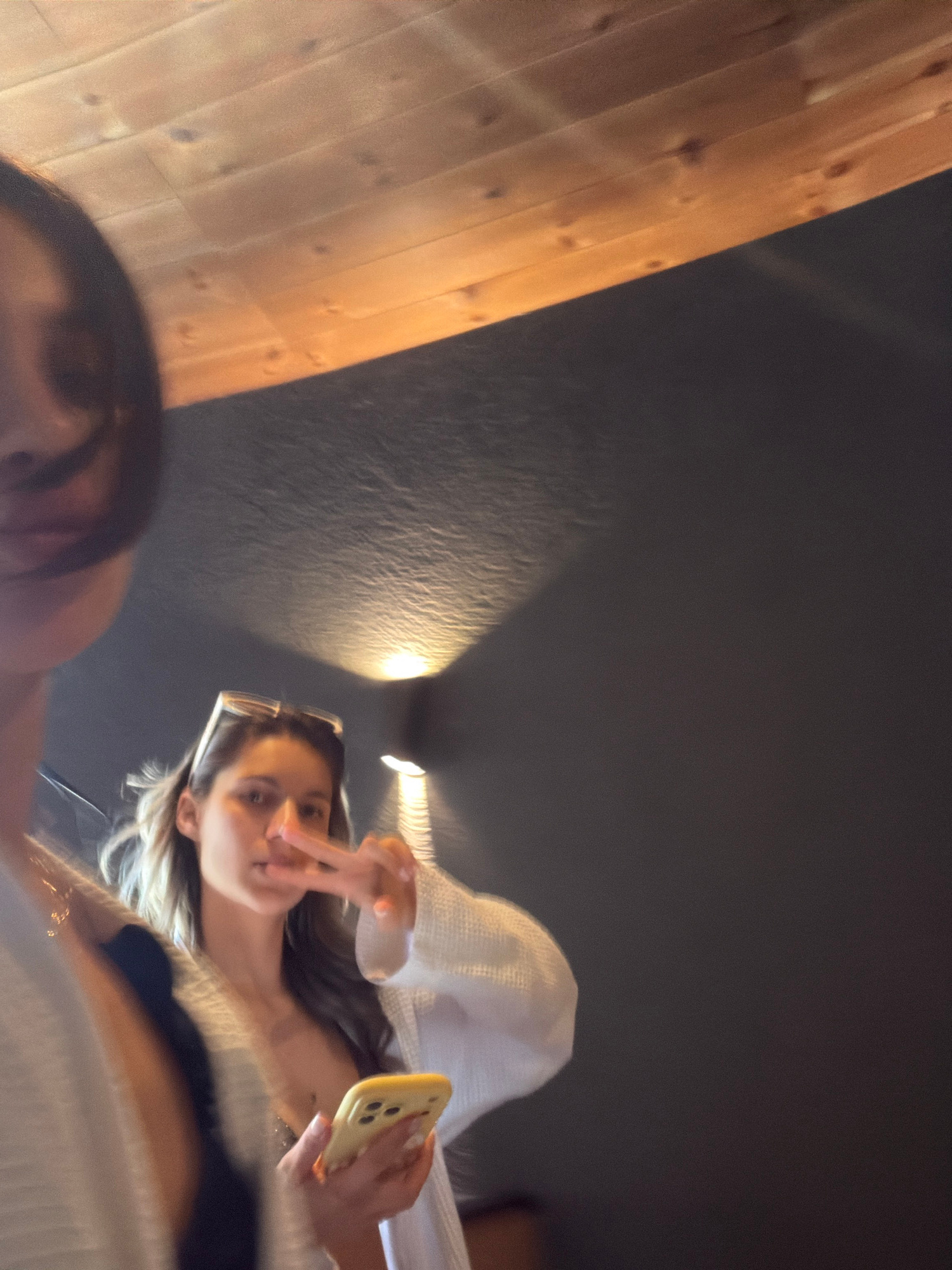 The image shows two people in what appears to be an indoor setting. One person is holding a yellow mobile phone and making a peace sign. Both appear to be wearing white bathrobes. Part of a wooden str…read more
