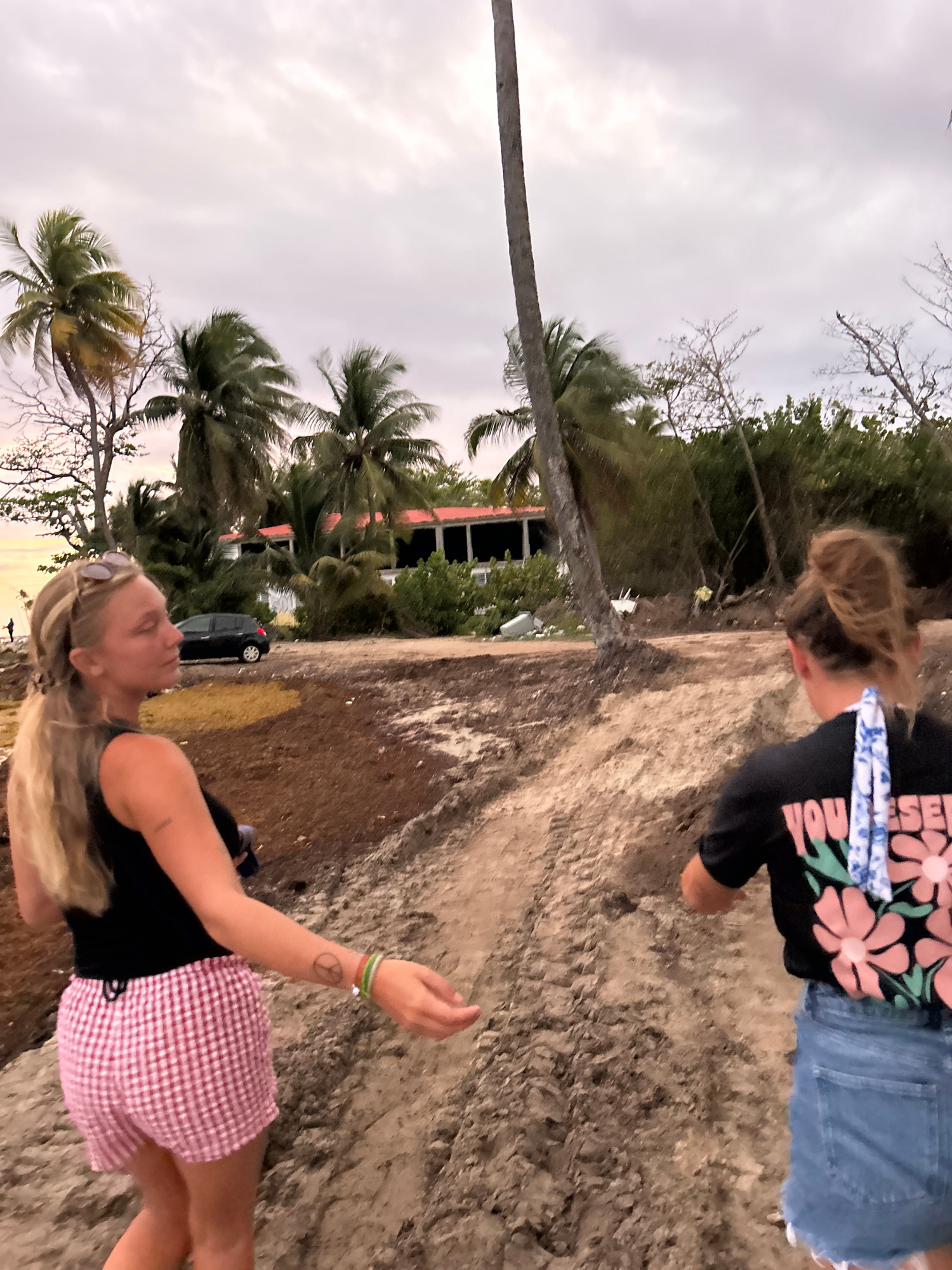 The image captures a scene outdoors, likely near a beach, in Sainte-Anne, France. The image has been rotated, with the horizon line appearing vertical. Two people are visible. In the foreground, a wom…read more