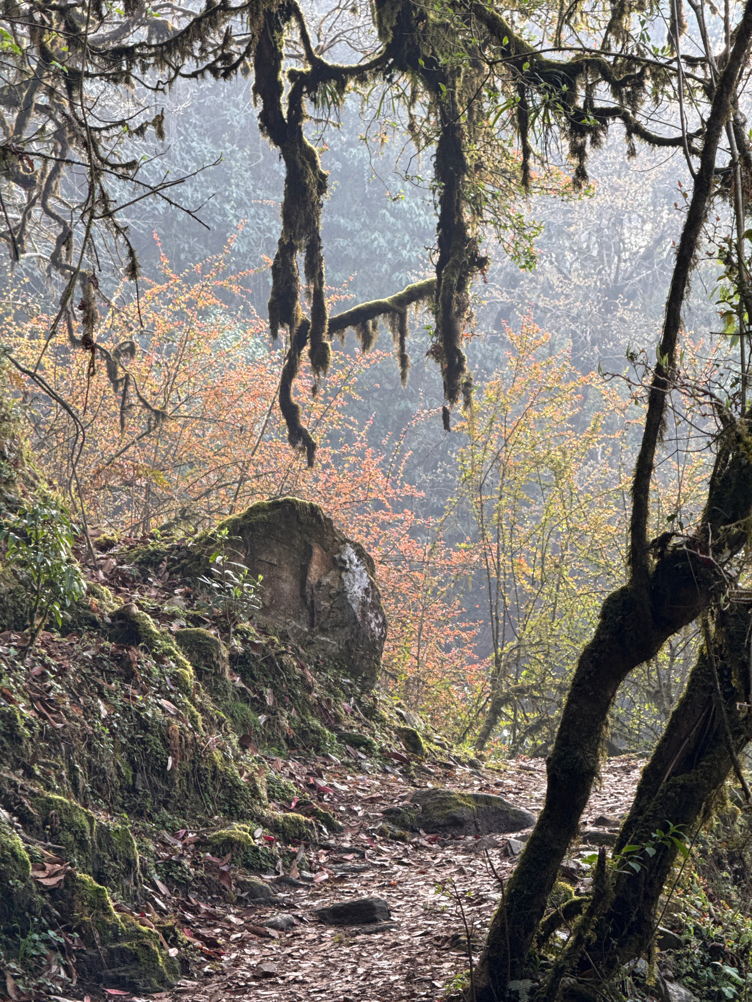 The image, oriented vertically, captures a dense, misty forest scene, likely in a mountainous region like Lumre, Nepal. In the foreground, thick, gnarled tree branches, heavily laden with dark green…read more