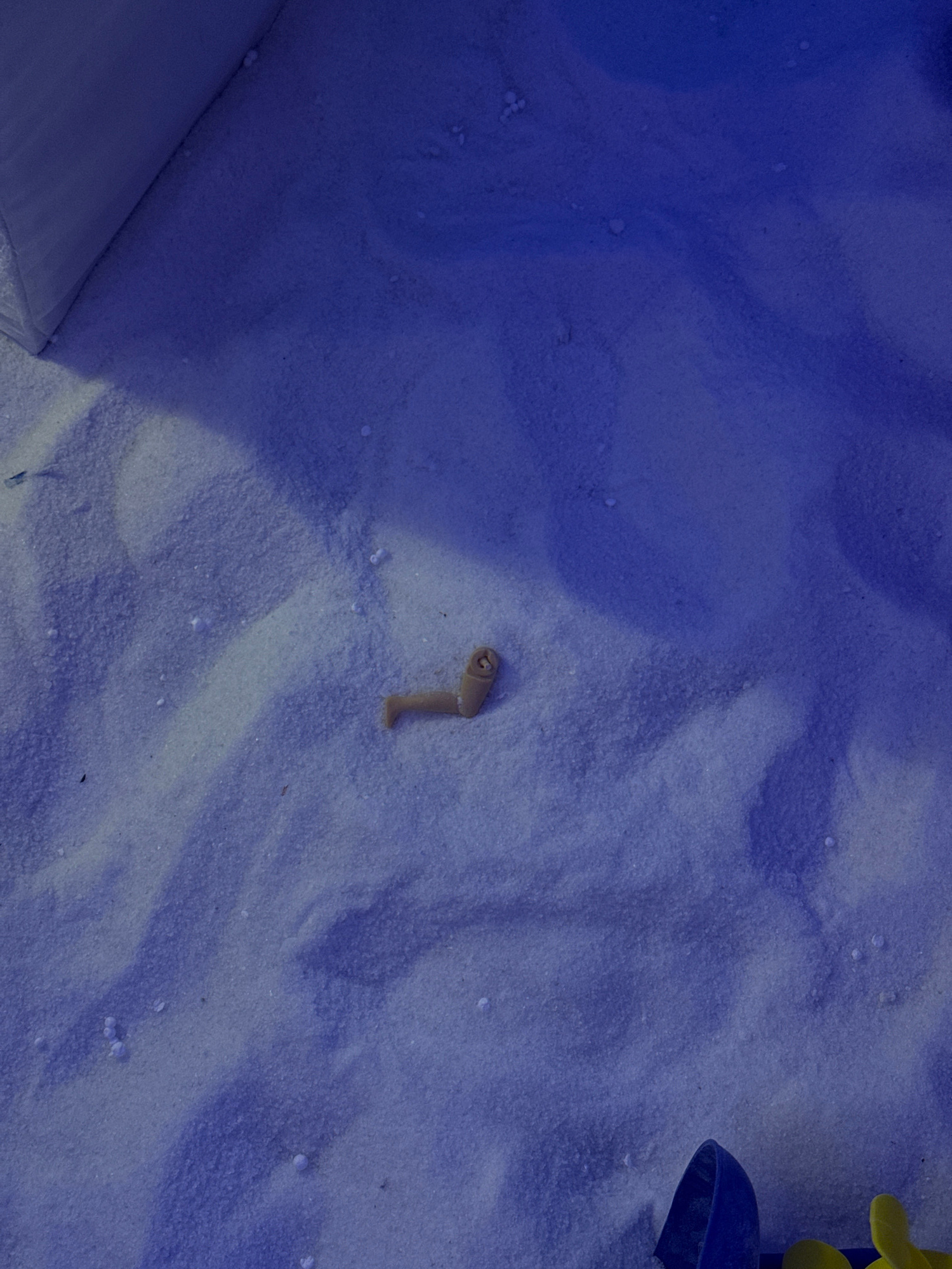 The image displays a close-up view of a sandy surface, heavily saturated with a dominant deep blue hue. This strong blue coloration suggests either a blue light source, a filter, or possibly colored s…read more