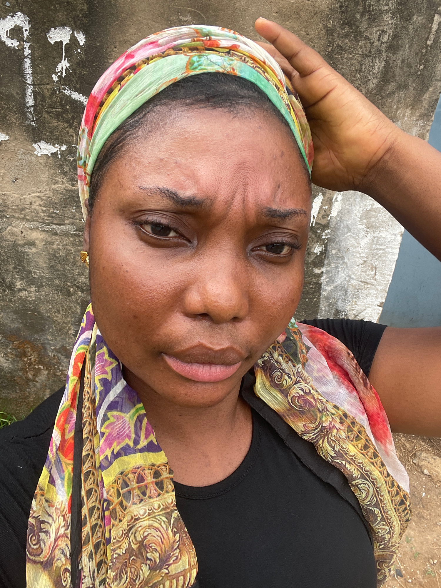 The image shows a close-up of a woman's face, positioned at an angle. She has dark skin and is wearing a colorful headscarf. A hand rests on her forehead. She is wearing a black top, and a patterned s…read more
