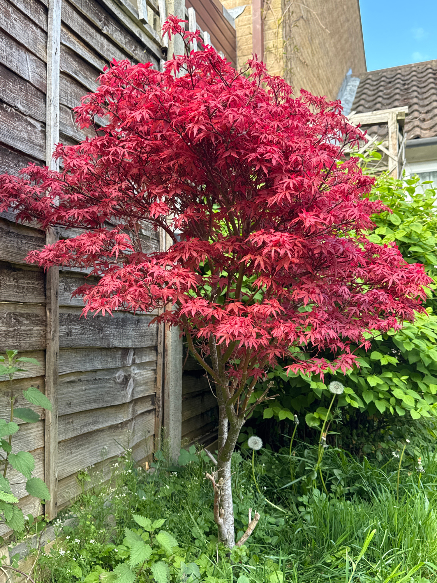 The image presents a vibrant outdoor scene dominated by a large Japanese maple tree (Acer palmatum) with intensely red, deeply lobed leaves. The tree's lush foliage occupies the central and left porti…read more
