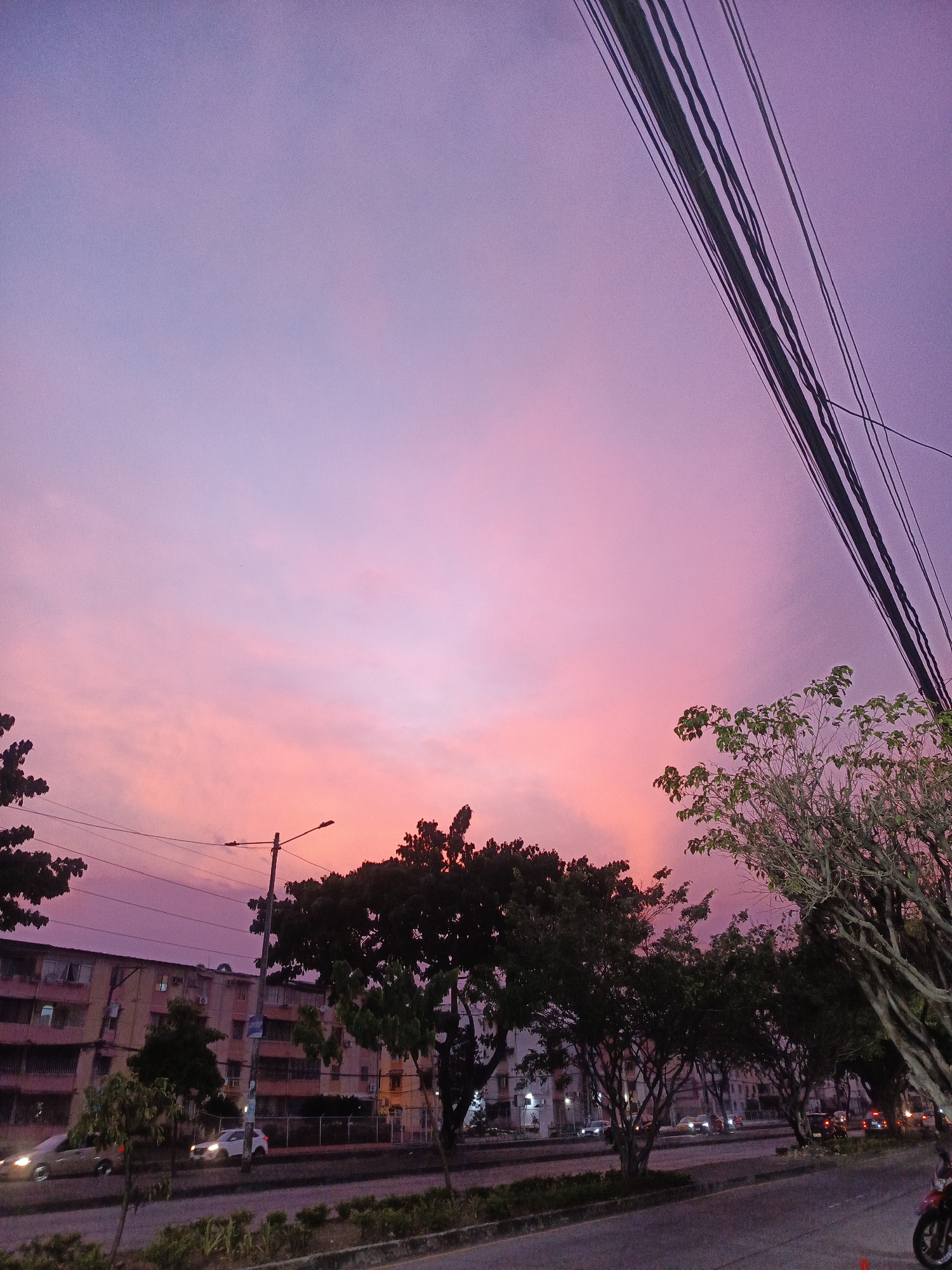 The image depicts a sunset over a street in Guayaquil, Ecuador. The sky transitions from pink near the horizon to purple higher up, with some cloud cover. Electrical wires extend into the frame from t…read more
